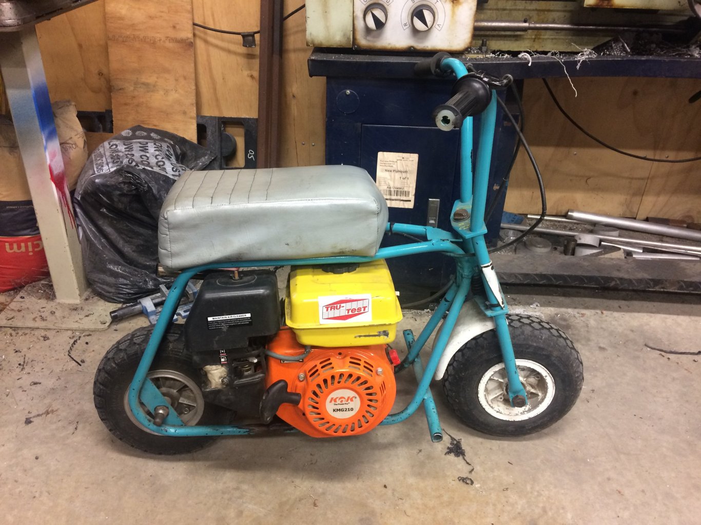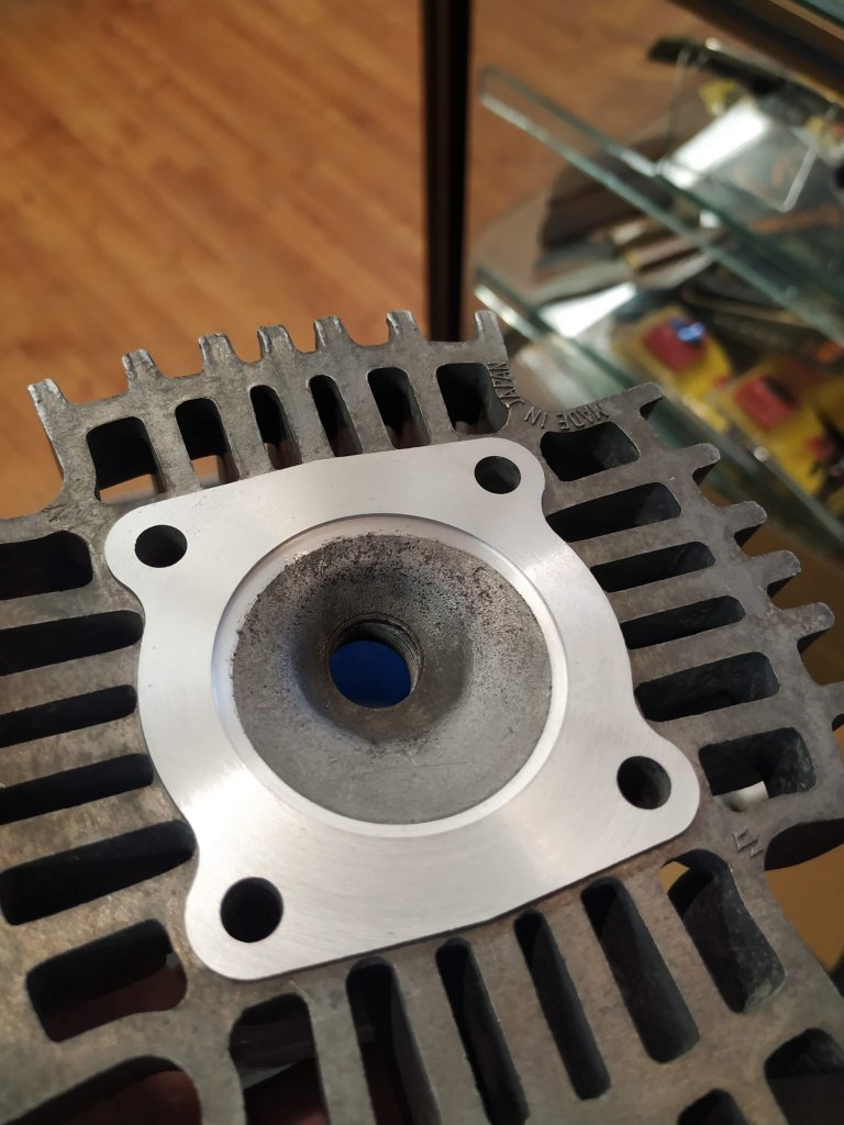 So as it turns out there is NOTHING in the way of a big bore kit for an A50 available, I can find listings for them from no later than 2005 so a bolt on A50 kit quickly became not an option. But I did discover that until recently Suzuki made another model, the K50 that was essentially a 3 or 4 speed low power version that was popular in Europe, main difference seemed to be that the K50 used a reed valve set up instead of the rotary disc valve found in the A series. Pics looked good so figured the 45mm kit would be good to go, so I ordered a kit from Denmark along with a new head, center stand, kick starter and other bits, also learnt that Danish KR is worth almost twice the NZ$ of Swedish KR Looks good right? Wrong Close to throwing a cover over it and walking away for a while a mate took my factory cylinder, welded on a new fin and said he'd hone it out after I ported it to try and get rid of at least the worst of the chamfering gouging. WIN! Or at least a win until I started trying to port it... The cylinder wall was paper thin and crumbly between the bore and the port, even a light touch with the die grinder just ripped chunks off So back to the K50 option... Black K50, Green A50 CNC plasma cut adaptor Cylinder skirt hit the crank webs and the cooling fins fouled the engine cases, so a bit of high precision engineering took place Cut a couple 1.6mm base gaskets to get the port timing right Not great! But we can fix that, we have the technology The kit head seemed to have come from a soup bowl factory Close to 3mm came off that! Fitted the clutch cover etc and gave it a couple kicks to check compression Not great, but better than the factory 95psi rating at least. Fired it up at 10:30pm one night, in the house, using air freshener as engine start so I didn't break my Mrs no petrol or engine start in the house rule... 2nd kick and it burst into life!!! And since it was so late, the exhaust port was all the exhaust it had and I didn't warn her, my Mrs just about had kittens hahahaha Spare room smelt like a warm summer breeze and I'm now banned from the air freshener, but I was so happy to hear it run!! Next day I fitted the pipe and pushed it outside, tipped a few liters of premix in and ran it for a couple heat cycles, once the rings bedded in a bit compression came up to closer to 120psi too. Fuel tap leaked like a sieve though. Sorted! Still a bit more to cover on the engine, it's actually still an ongoing thing, but you've read enough of my drivel for now lol1 point