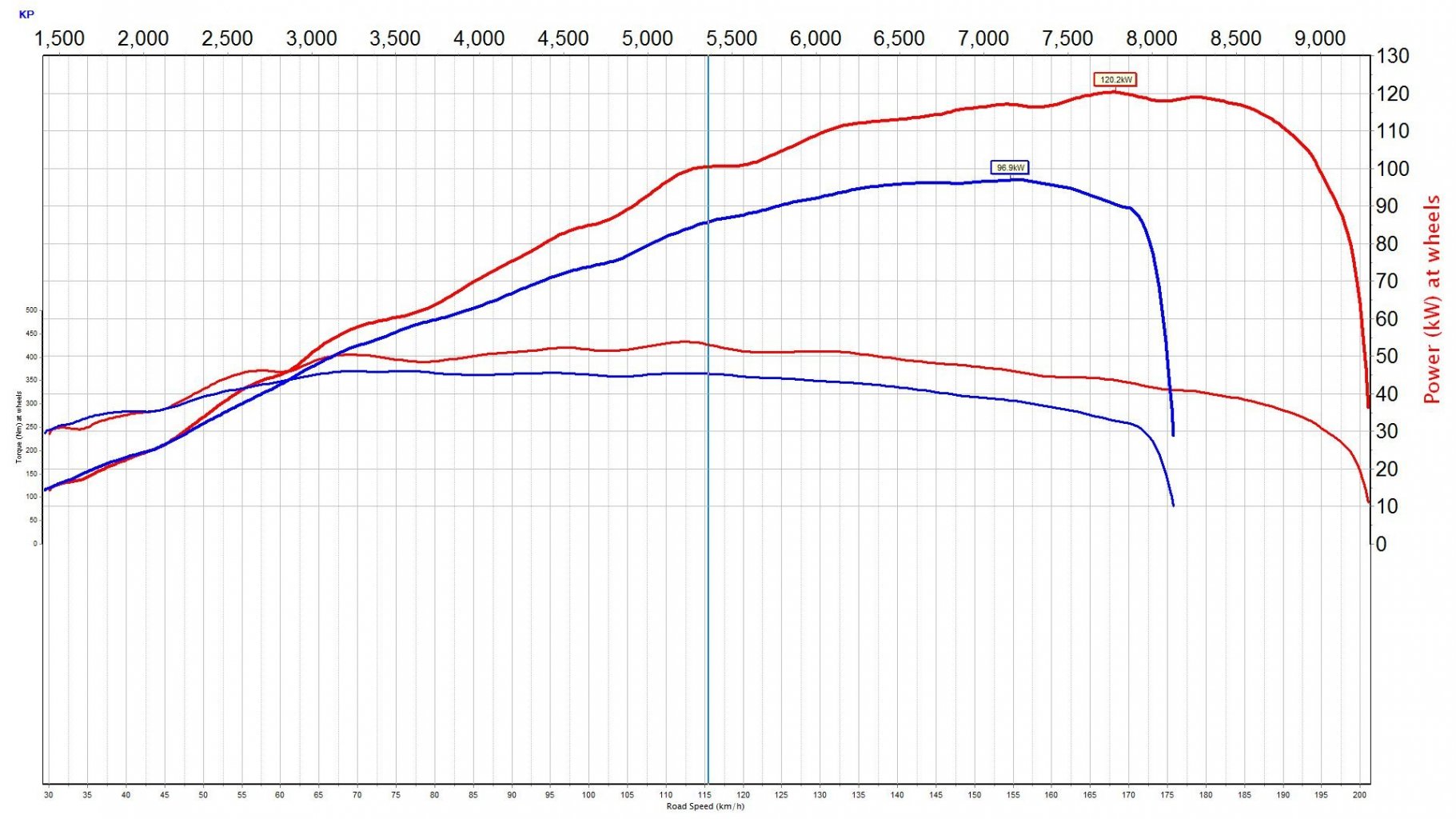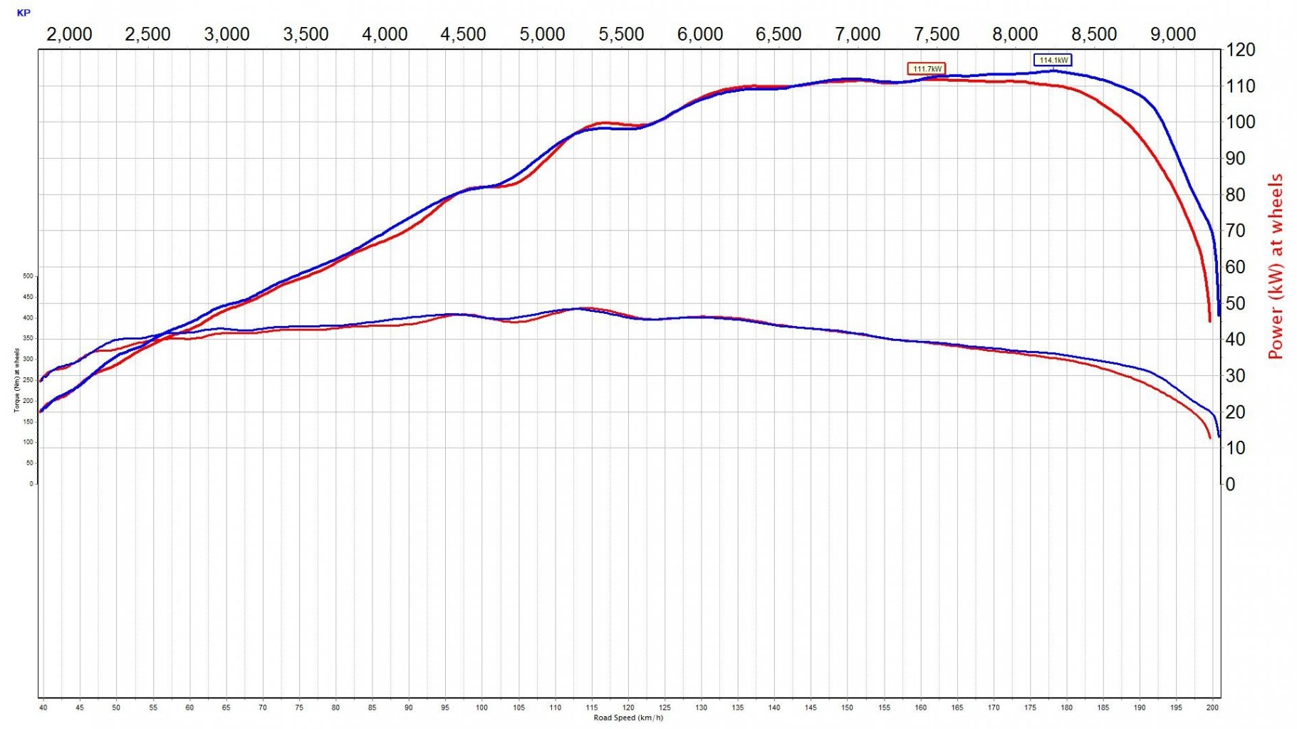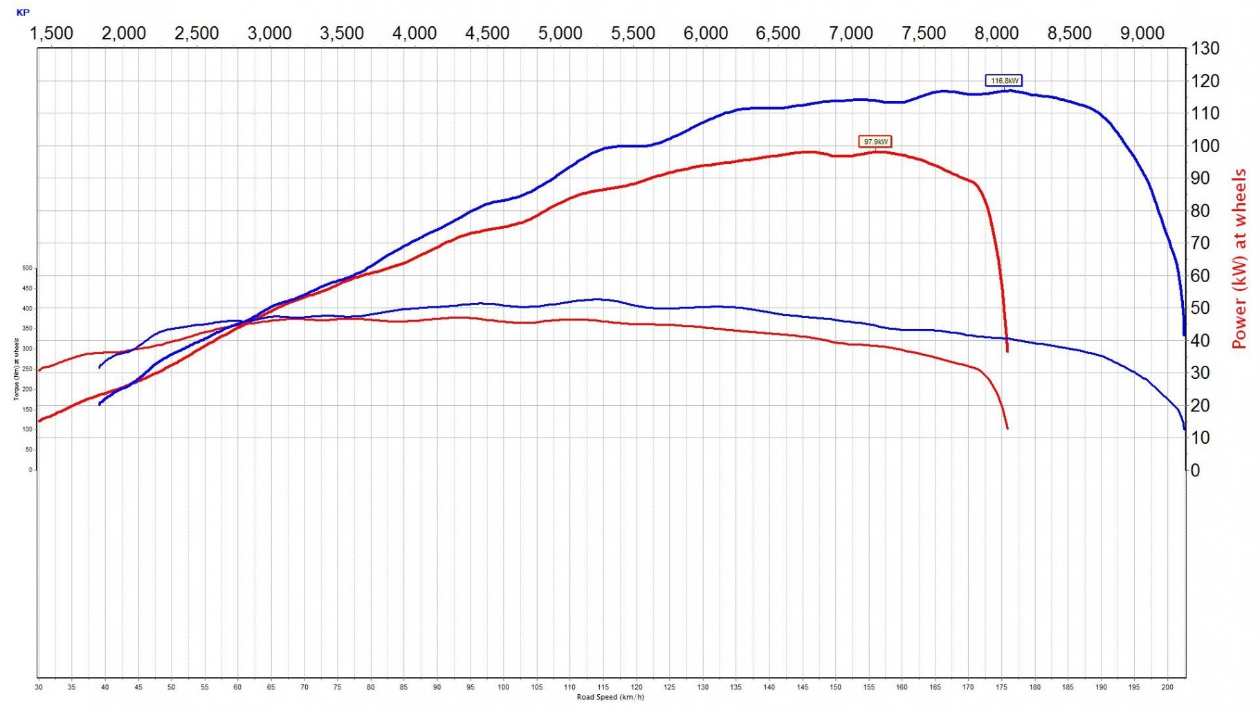 Ok, so i ignored all the oil leaks and bent valves, put it on the dyno. most of its working as planned. im not sure how fast its meant to respond. this is unloaded 1st,2nd,3rd and bit of 4th on dyno. which is a bit faster than it would accelerate on the road. It doesn't keep up in 1st, which is borderline free revving. but the rest is pretty good. some adjustments probably can get it even better. first attempt I had it setup for too much advance and not enough retard. so skipped a tooth on cam belt which got it pretty close. after a few runs with cam timing fixed at different settings, built a rough vvti map. using around 35 degrees of travel throughout the rev range. It could go a few more adjustments, as can see in the graph below where the fixed timing slightly edges it out in places. Doesn't look super impressive, but weak stock cams will do that Red is vvti holding 28degrees throughout rev range, which simulates the best compromise on a fixed timing setup blue is my rough vvti map To get that 114kw peak on a fixed timing setup would lose a huge amount of midrange After that i had a play with the exhaust cam timing, was slightly off. then run it up at 100deg oil temps. i usually run tests at 90 or 95 because easier to keep there. but hotter oil will make more power Almost 117kw with stock cams (not even bluetops) and some bent valves and an amazing amount of smoke coming out the exhaust. must be some kinda record? red is stock ish bigport. same good header and exhaust. stock intake. same cams!1 point