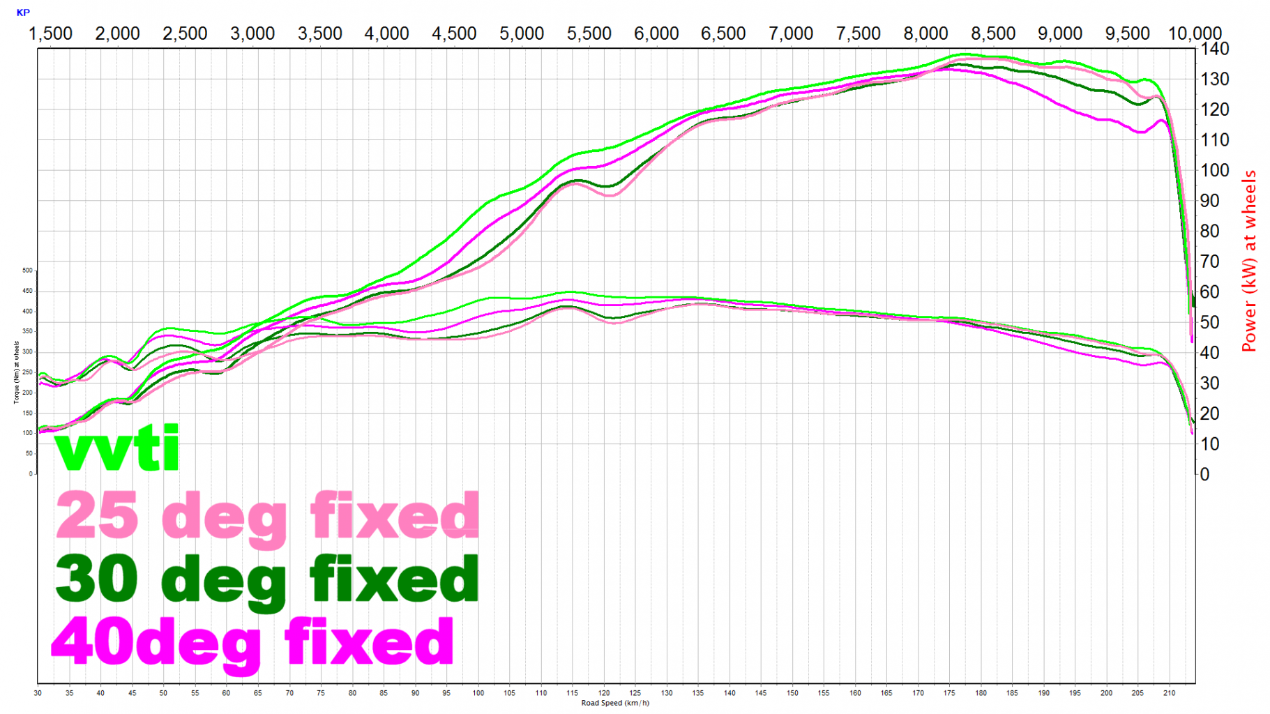 You'll loose bottom end using big cams and modifying your NA engine. Ok i'll take the hit at 1700rpm The vvti works amazing on the bigger cams, nothing like the weak gains on the stock cams. Some fixed timing compromises: Light Pink (salmon?) 25 deg- pretty much matches the peak power. but massive hit in midrange Green 30 deg - kinda blah. may as well run 25 as above ^ Pink 40 deg - probably good compromise for midrange while not loosing a whole heap of peak. good if didn't want to rev past 8500. Bright green vvti - all the power everywhere. actually using way more range that i thought i would need, about 45 degrees. I didn't spend very long at all on the vvti map. so some tweaks may get another kw here and there. and yes it made 138kw!2 points