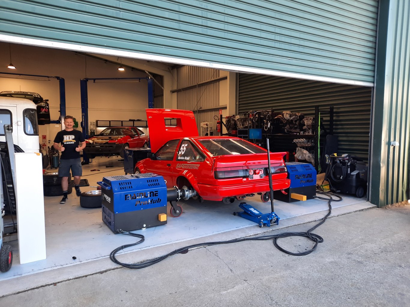 A couple of solid days work and she runs!!!! Mounted fuel tank, plumbed up last of fuel, and water meth systems. wired in pumps, made up throttle cable and mounts, refitted rear brakes and new lines, all fluids done, brakes and clutch bled etc Cranked to get oil pressure up, checked all fuel fittings for leaks then a mate came over with his Microtech handset and punched a few numbers into the computer and I turned the key...... HOLY SHIT - it caught us all unaware!, it literally fired up into a 3000rpm idle on the first 2 second's of cranking, had to scramble to keep it under control. Its angry, I mean real angry!! , once idle came down it just pulsed its head off, instantly we now know I have to solid mount the motor, it was shaking side to side so viciously we had to turn it off to set the idle, couldn't get near it Unfortunately I couldn't take it around the block as we found the new alternator not charging which will just play havoc with the ECU, pretty sure as it doesn't have a dash charge light, we have to wire one in to excite the alternator. It was getting pretty hot too, I had kept the fans wired as per the BP it used to have, but will swap it over from a manual temp sensor to the ECU to be able to set the temp to a lower point so the fans come on earlier, I may look at upgrading them too. Super stoked with only a few things to rectify before tune!7 points