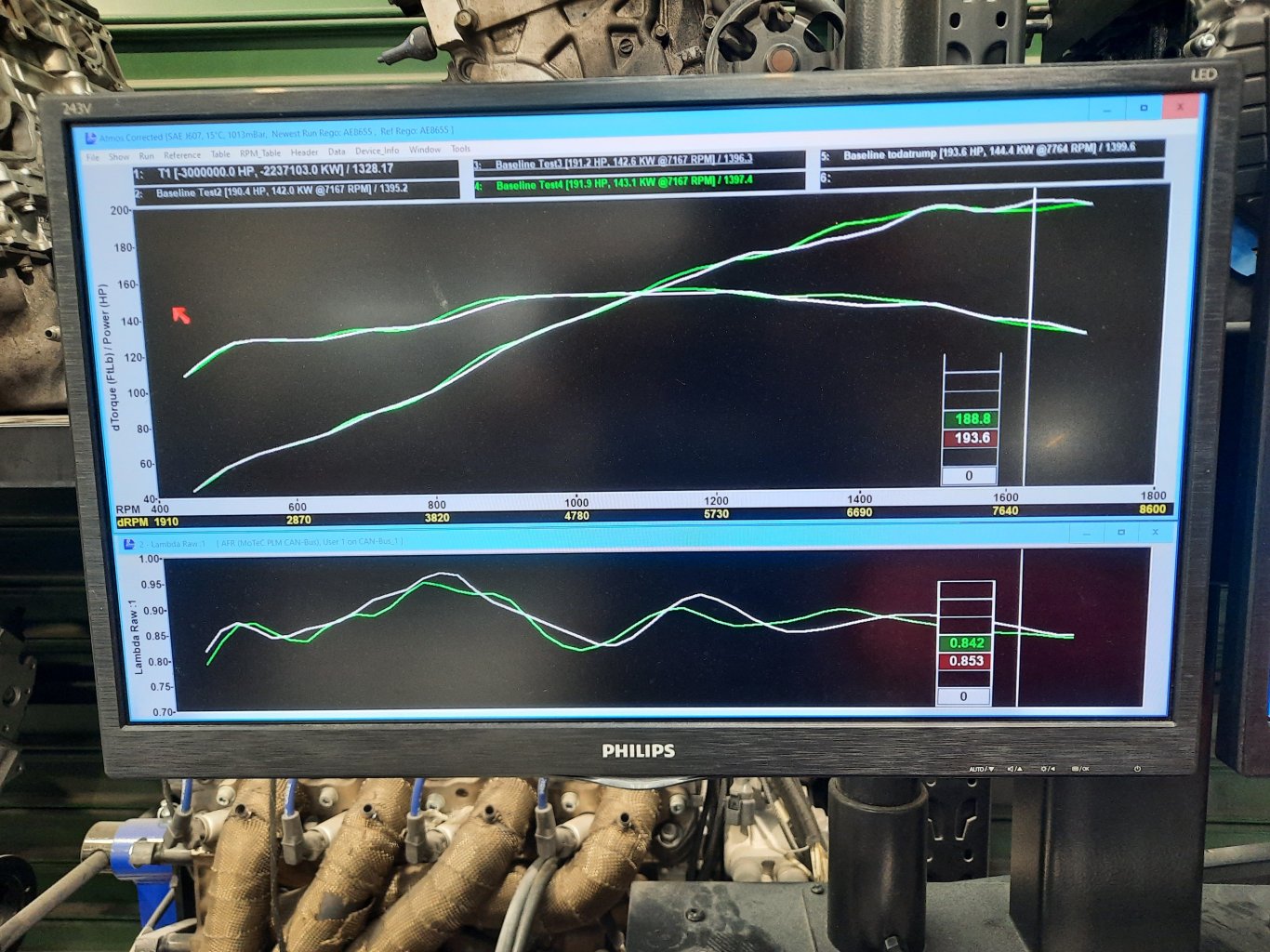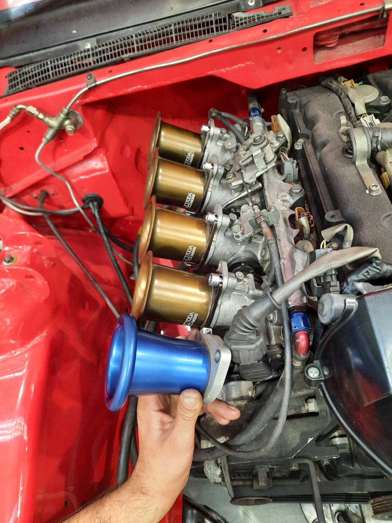 Bolted this thing onto that thing to get a baseline before making a few changes. Gave it a couple of quick runs, then swapped the trumpets from the 95mm blue ones to 75mm bronze just to see what might happen. 95mm trumpets are the green line, 75mm white line. The AFRs are pretty messy and we haven't touched any tuning, just swapped trumpets and ran it again, so maybe the shorter ones will work after some fuelling and VVTi changes? There's a set of 48mm Jenvey ITBs floating around at work and one of the guys has 3D printed a manifold to test. It'll be interesting to see if there's a difference from an extra few mm of throttle plate, and I'll give a few different bell mouths a try at the same time. I'd really like to try 50mm or even 52mm just to see if there's any gains.... will see If I can find a set to try.1 point