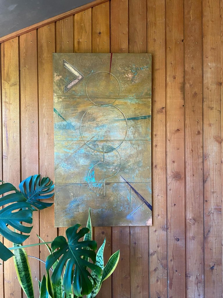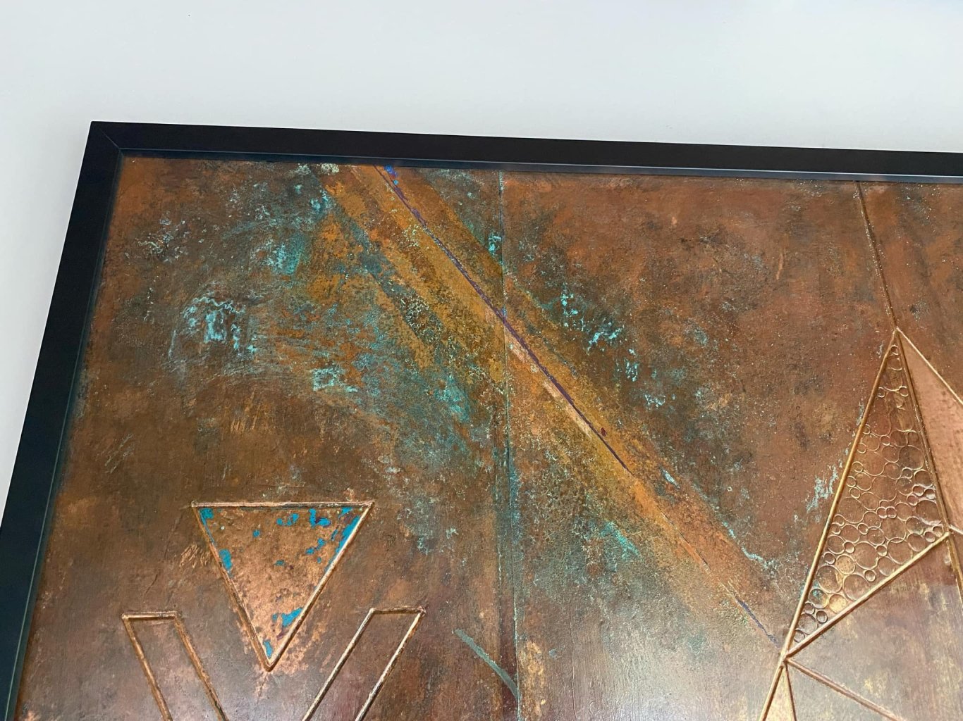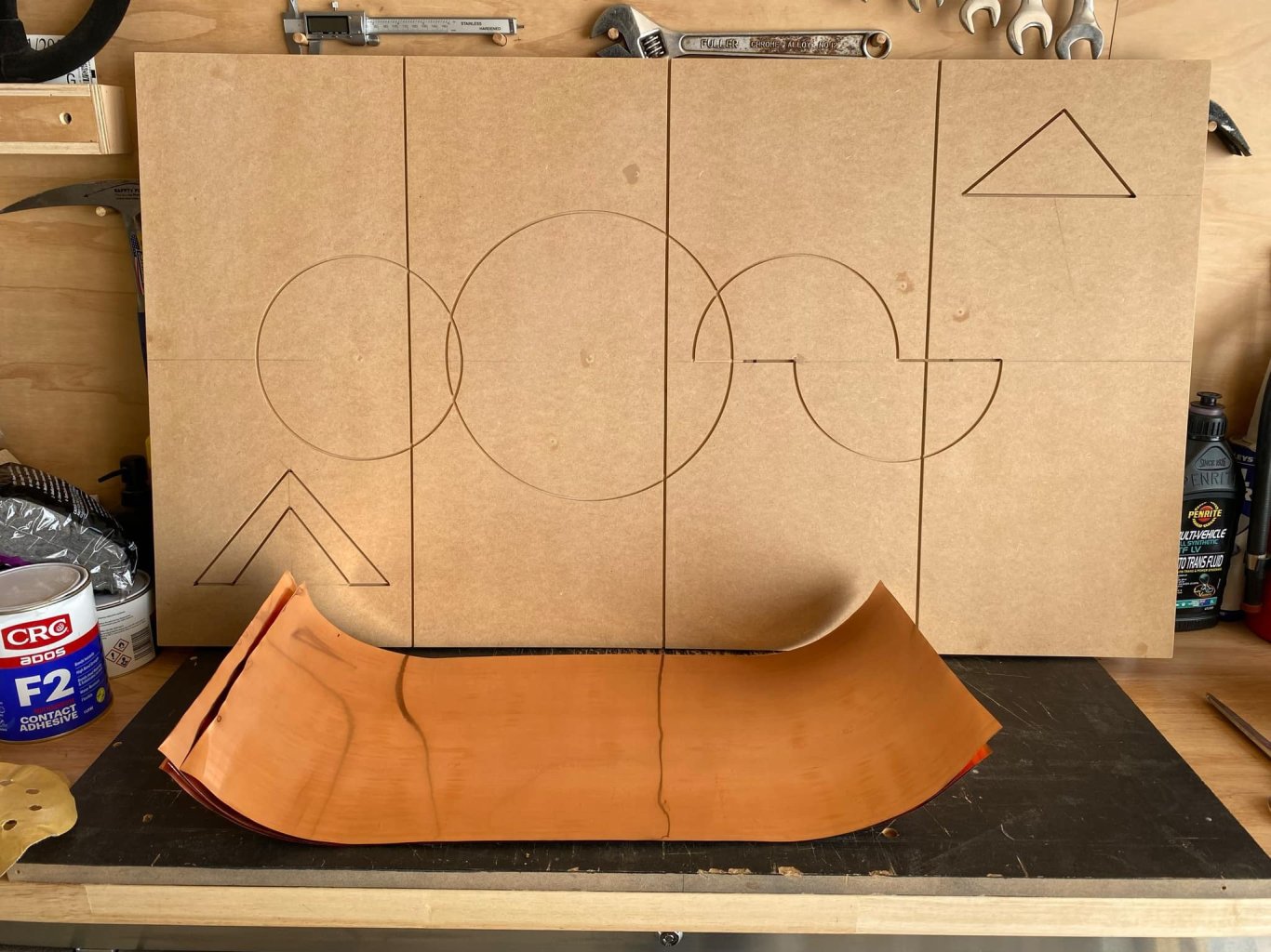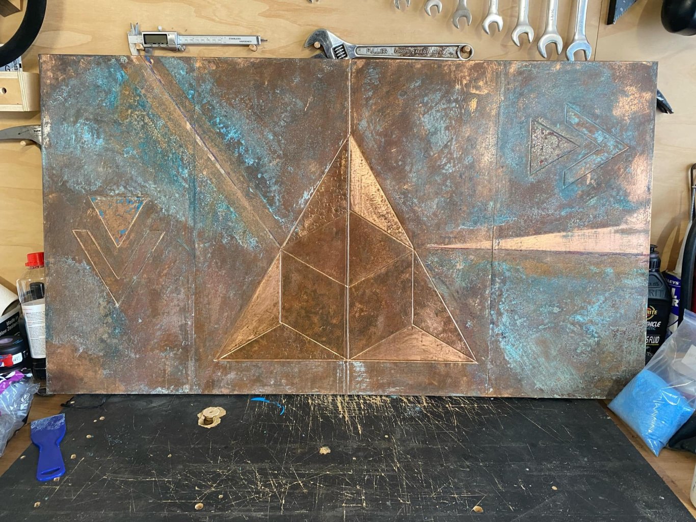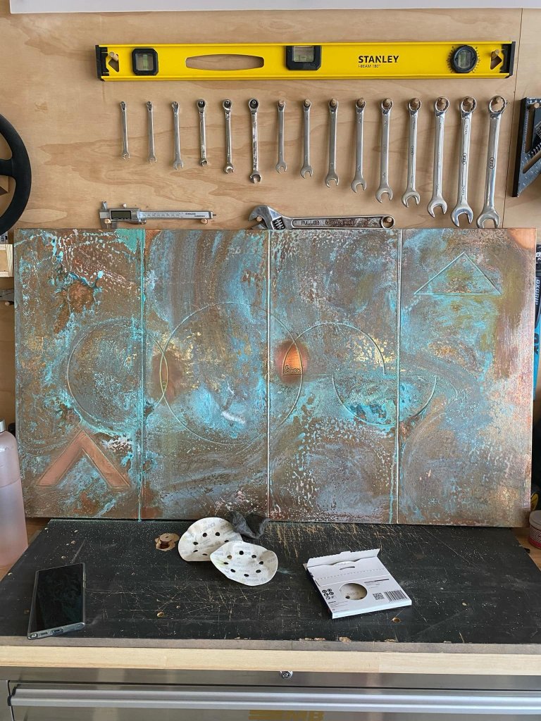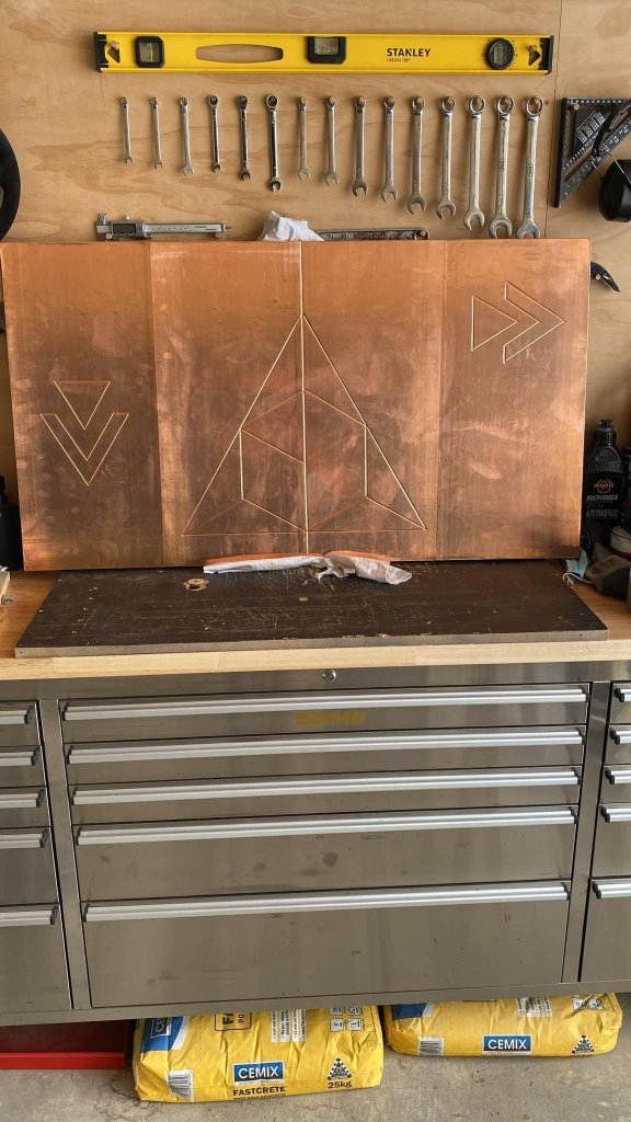 I’ve been experimenting with copper artwork things, same friend who does the veneer patterns showed me some tricks. Pattern router cut into a piece of mdf, copper shim rolled on and then pressed into the grooves. Then discoloured the copper with various chemical reactions. Finished with shellac to seal them up. Went ok for a first go even though I fucked up some of the joins in the copper. Made another one, I’m a fan of geometric stuff so dug the compass out of the pencil case and drew this up. Discoloured this one a bit more, then added some paint and did a final chemical application, sanded and sealed with shellac again. Paid to get it framed, quite happy with it. Up close the colour is more obvious1 point