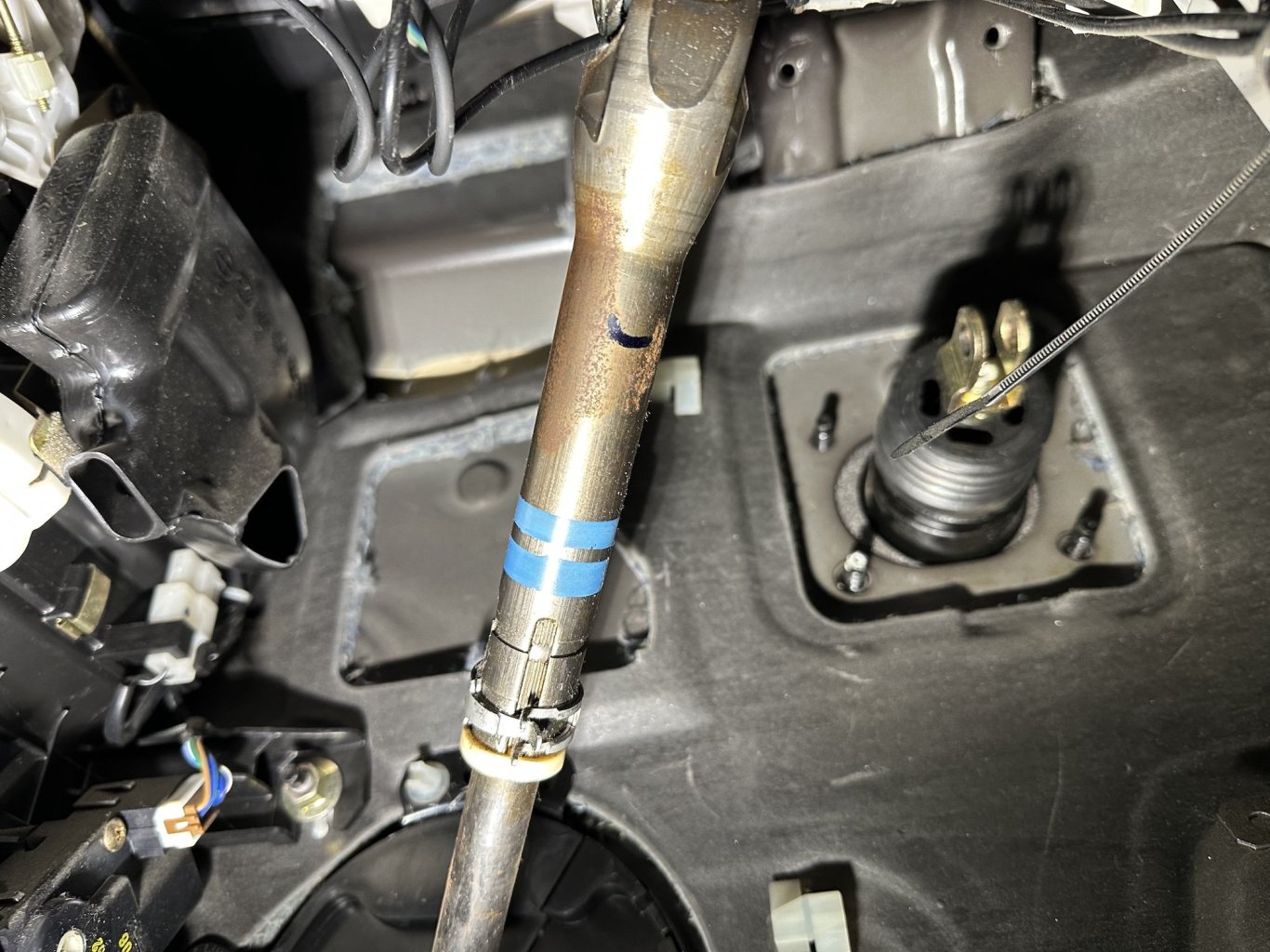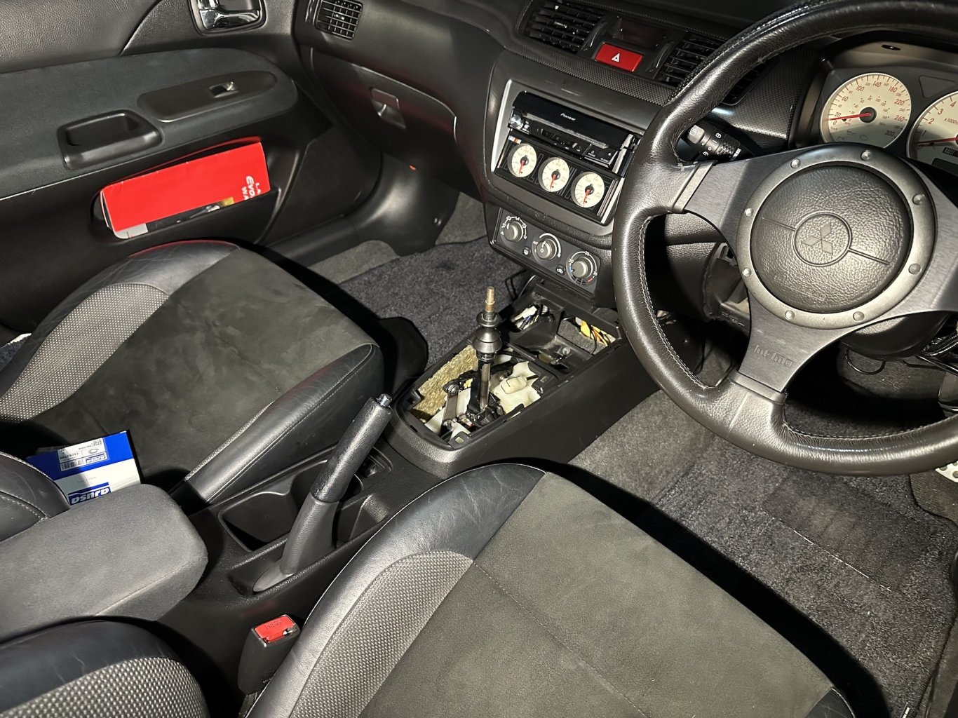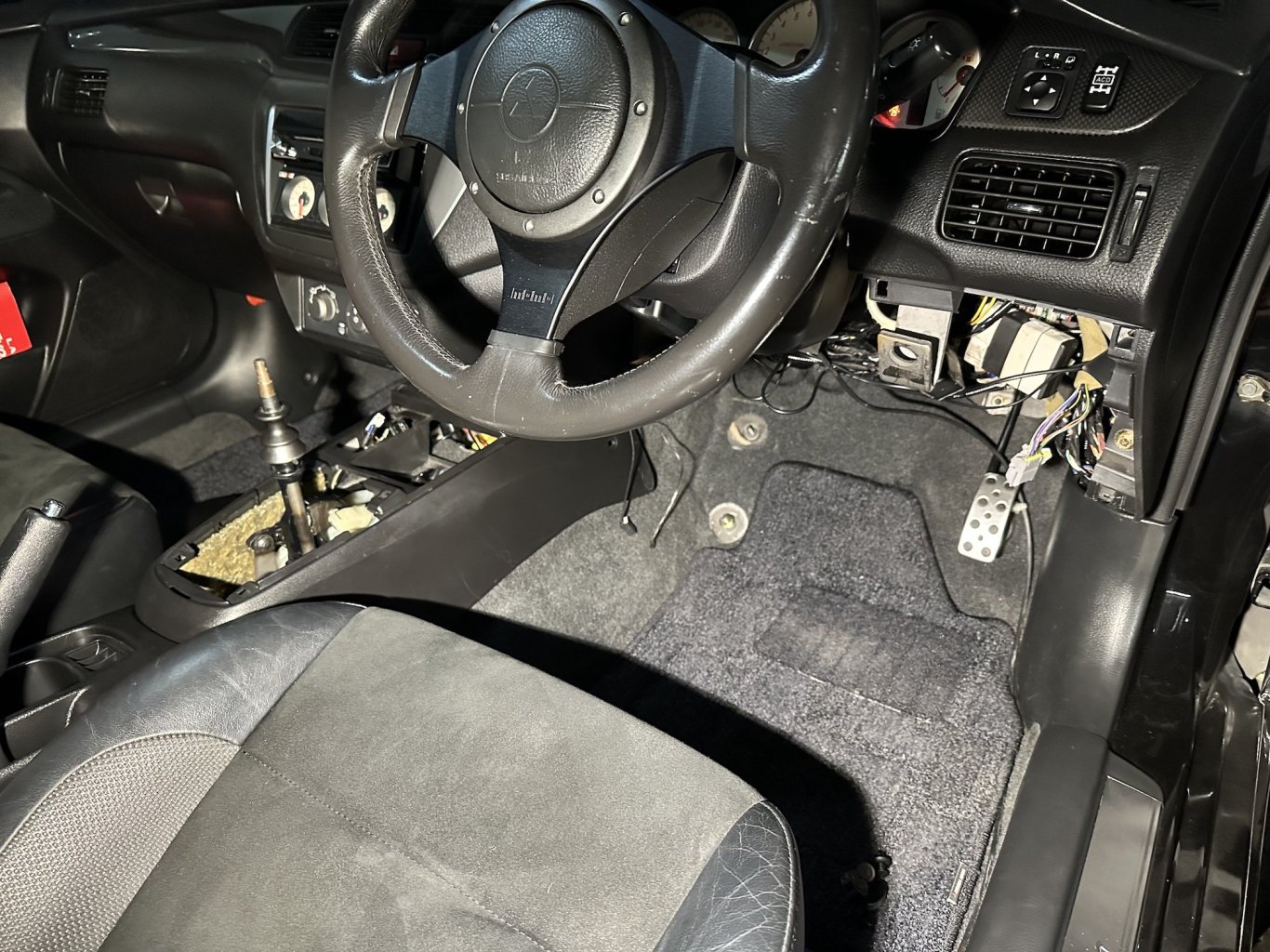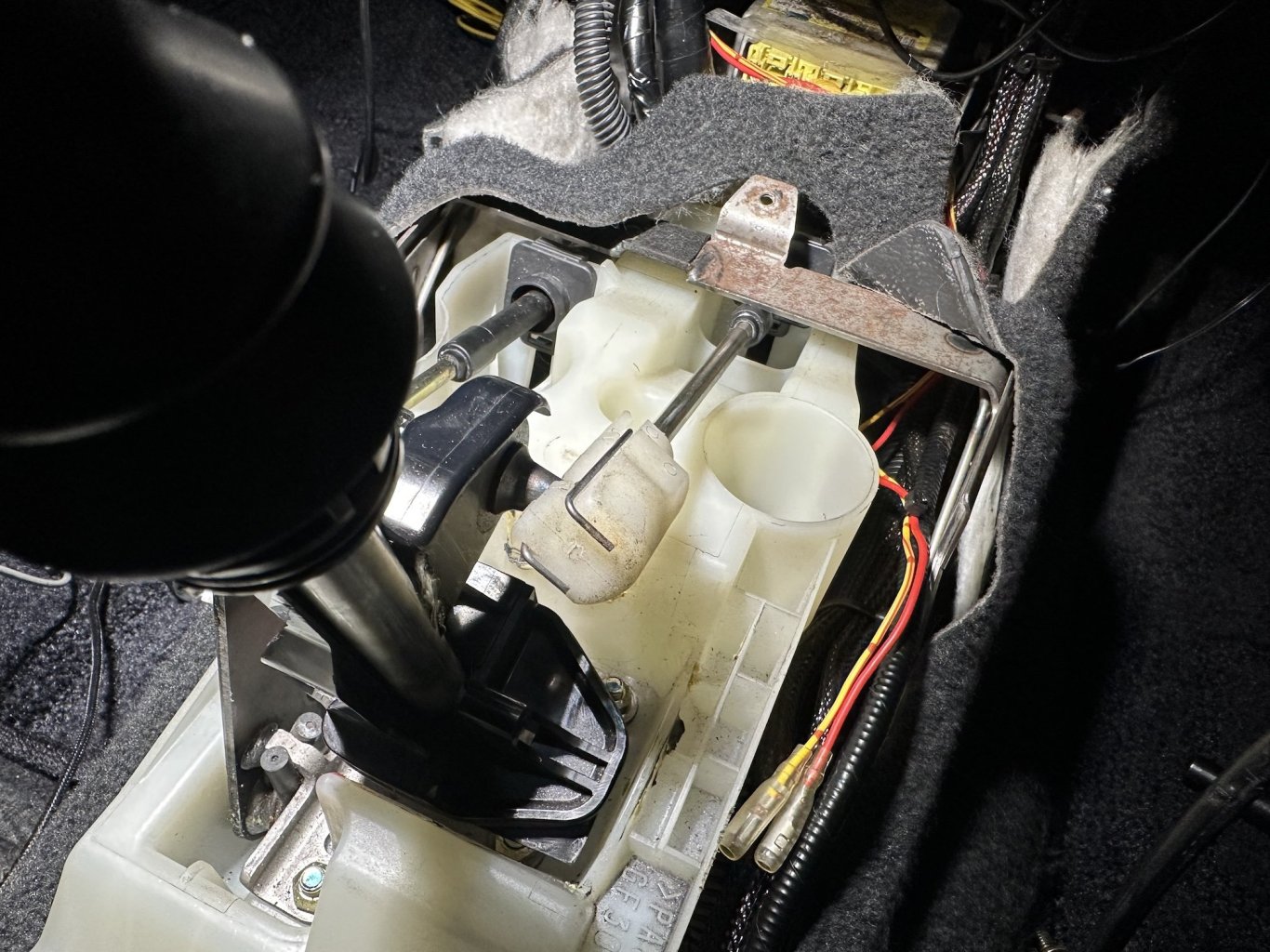Didn't get as far along today as I had hoped - but I did manage to swap in the manual shifter after cleaning up the 20 year old Japanese crumbs and dirt. I did have a little issue with the centre console mounting bracket interfering with the shifter cable - it seems this bracket is specific to the autos for the 2005 model year, but for the 2006 model year the autos just ran with the same bracket as the manual models. I might be able to find that bracket from a regular plain Jane Lancer at the junk yard - or if I get desperate I could cut a clearance notch into it. The shifter cable firewall flange bracket was a PITA to get buttoned back up to the firewall too - those two bolts were so hard to access going back in. Starting to look more like a manual now1 point