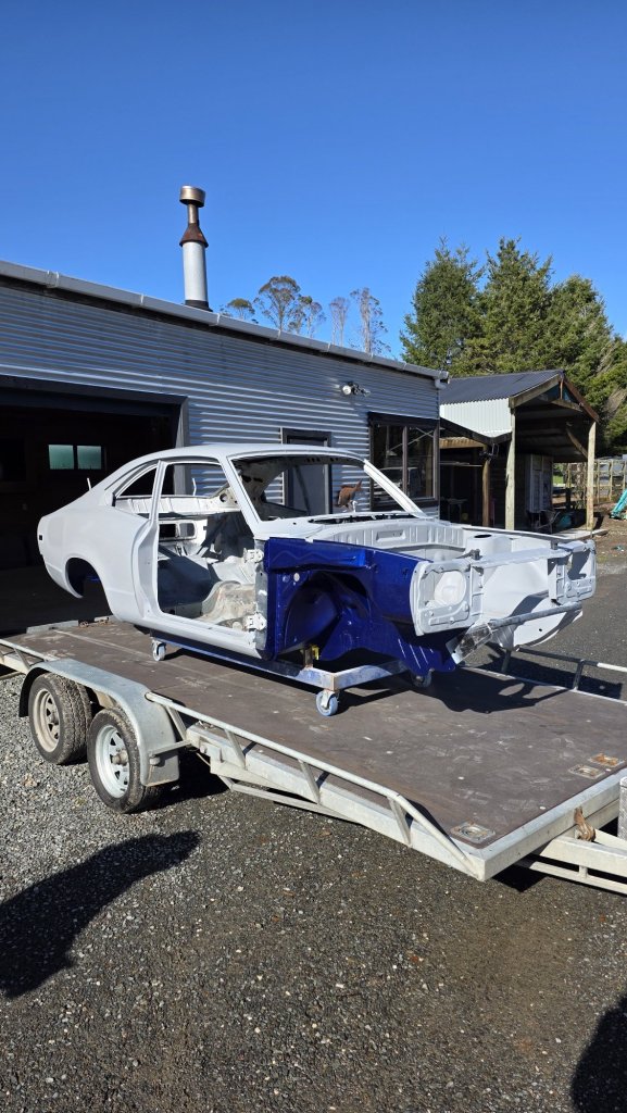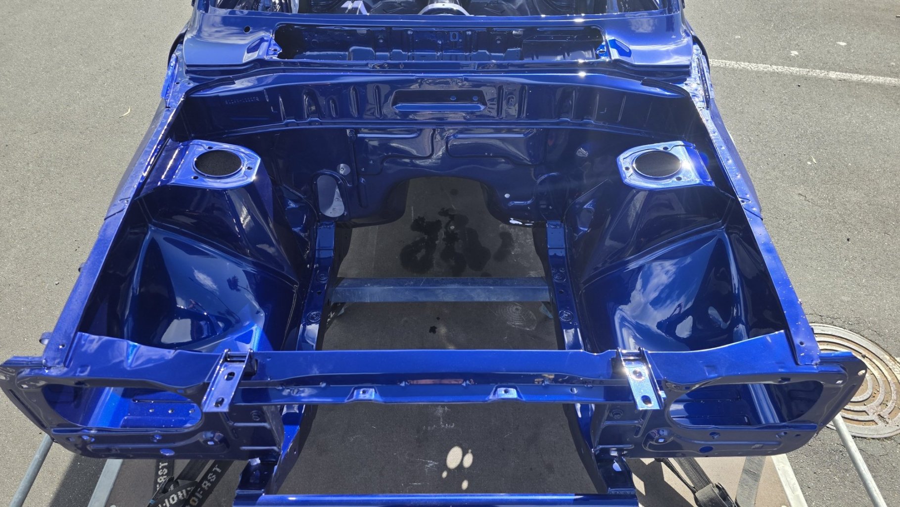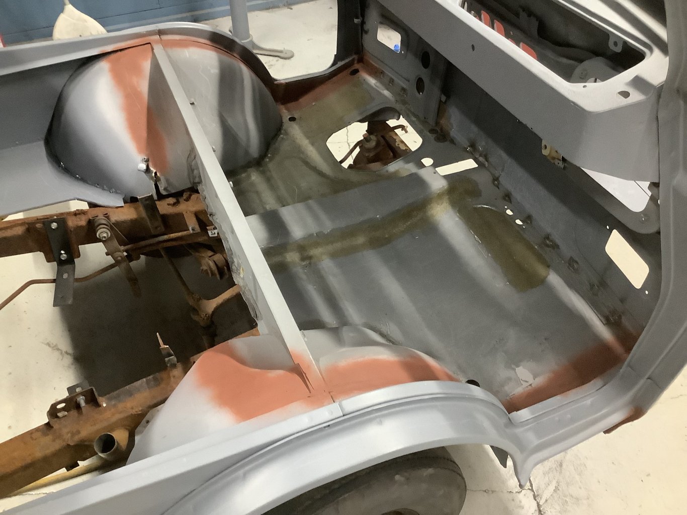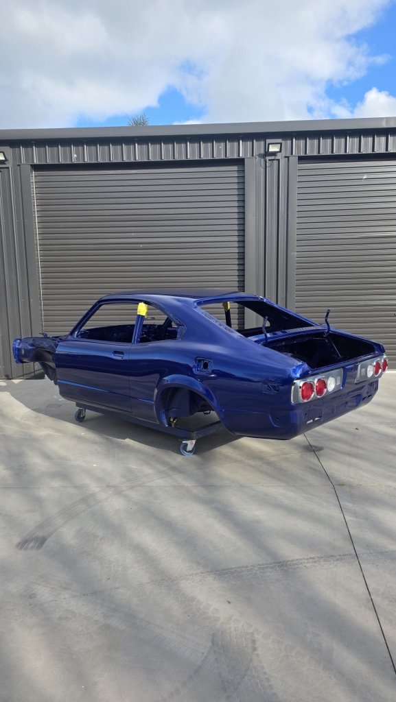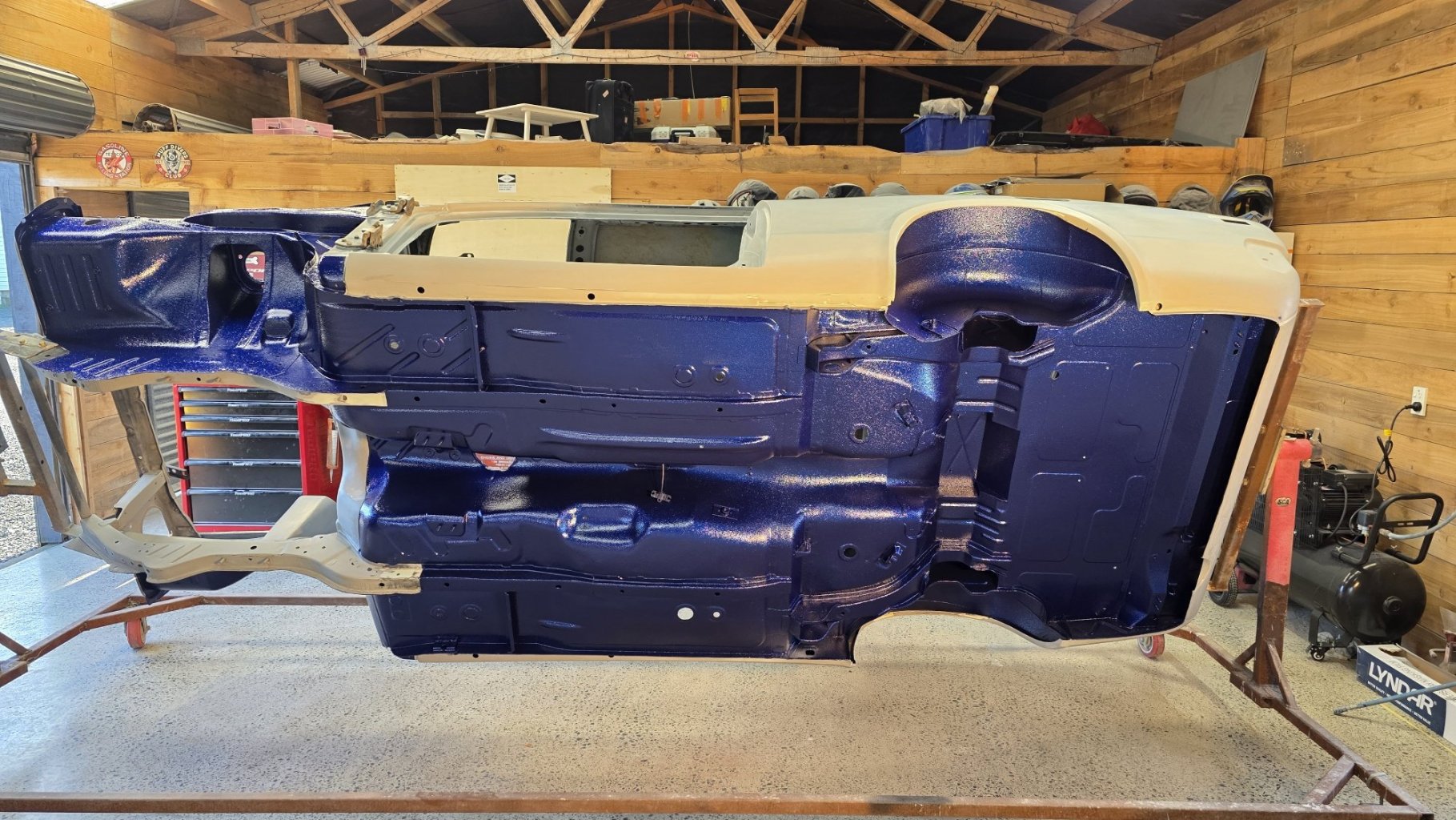 ropped the car off to the painter early June and hes been ripping into it since then. Got the outside all primered and blocked ready for paint. Hes spent some hours on the block but its come up straight as! Once we got it prepped we got it up on the rotiserrie to prep and paint the underneath. Undersealed, coloured and cleared as well as up in the inner guards. And then it was time to paint the inside and exterior so back on the jig1 point