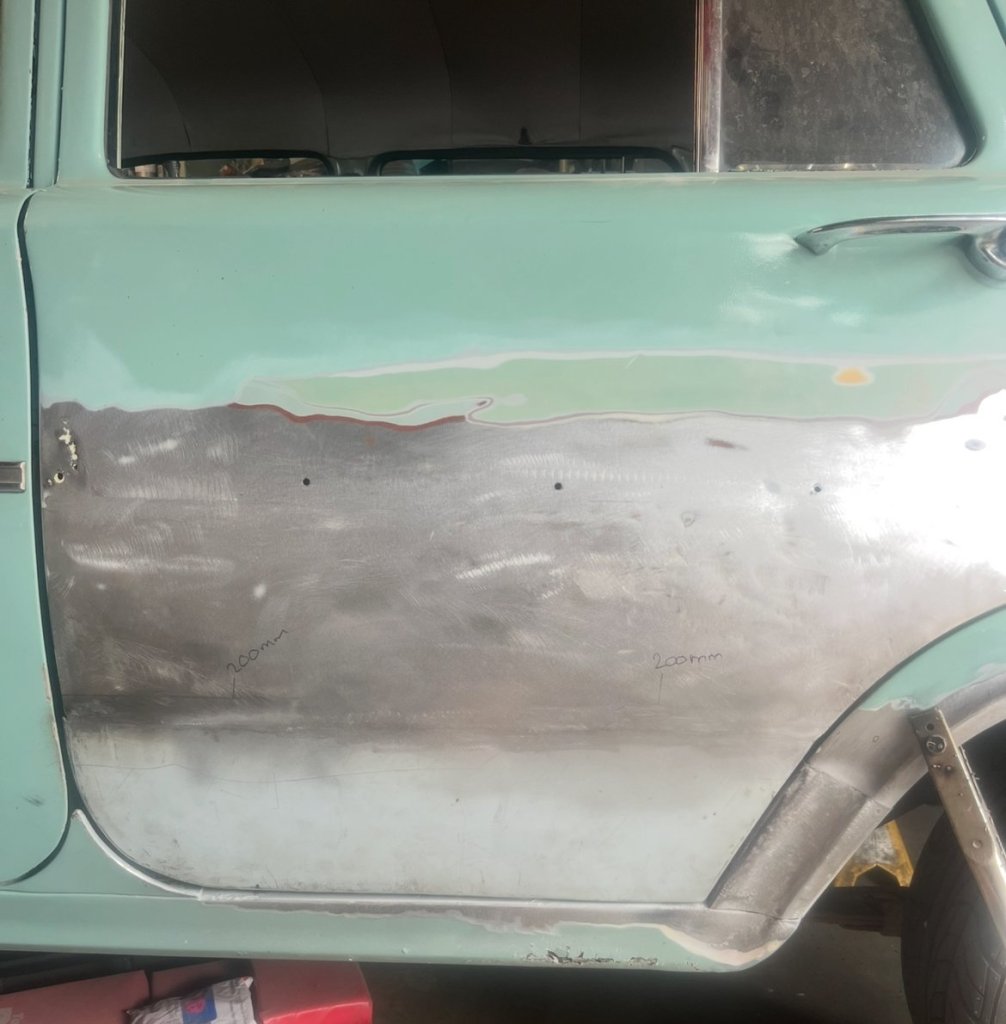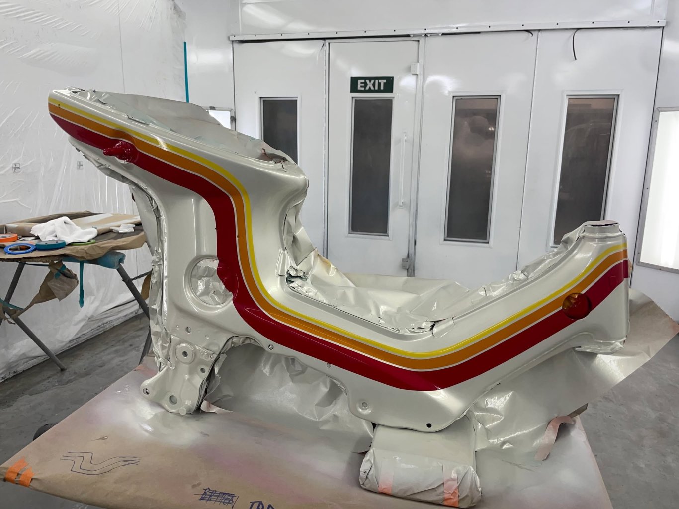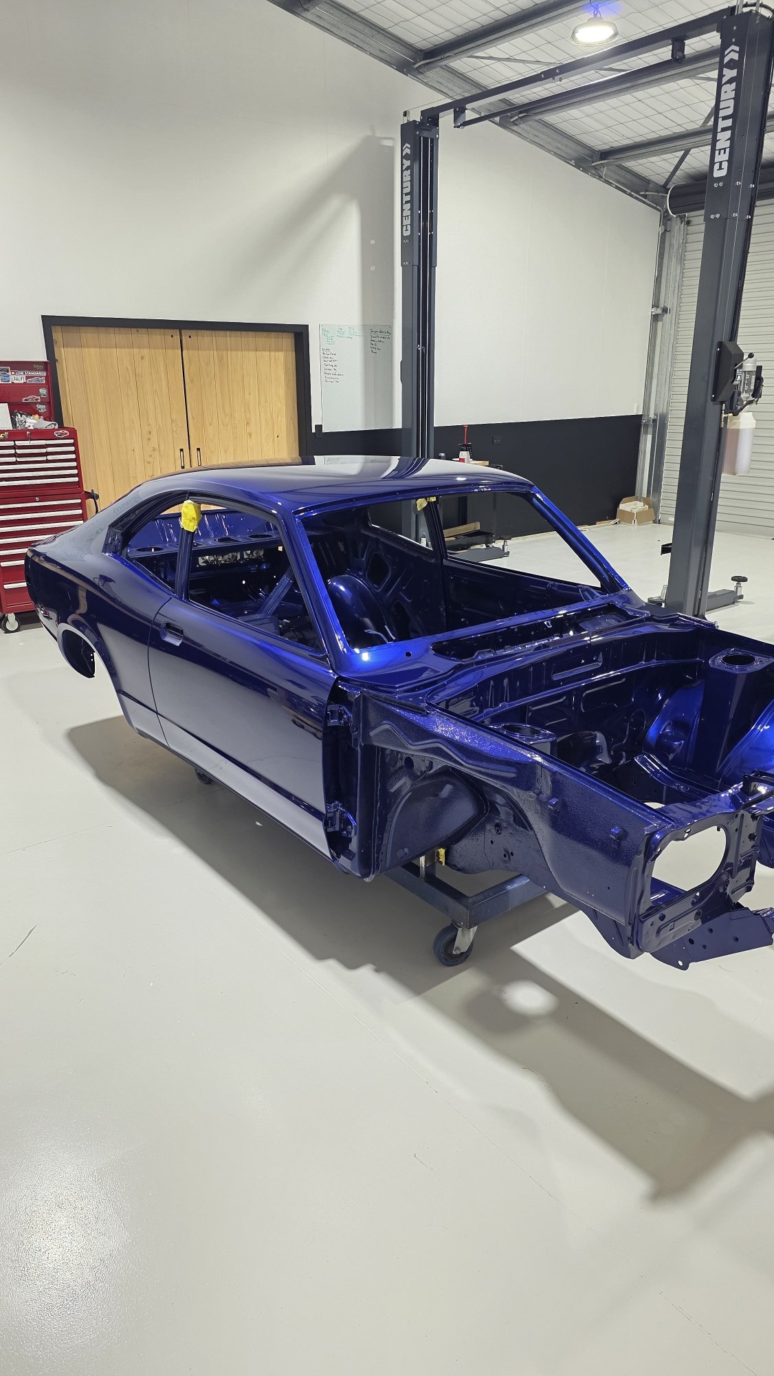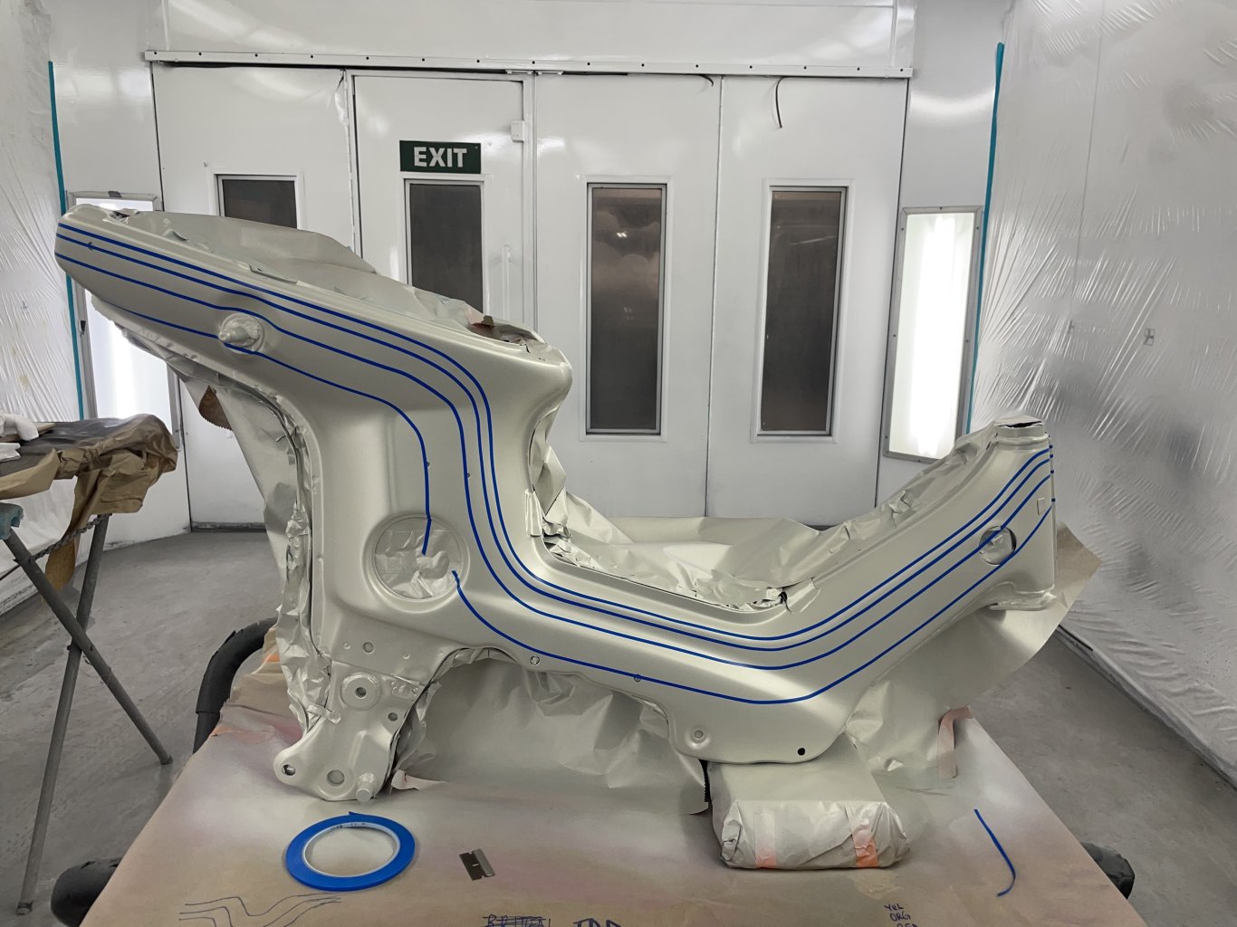 ropped the car off to the painter early June and hes been ripping into it since then. Got the outside all primered and blocked ready for paint. Hes spent some hours on the block but its come up straight as! Once we got it prepped we got it up on the rotiserrie to prep and paint the underneath. Undersealed, coloured and cleared as well as up in the inner guards. And then it was time to paint the inside and exterior so back on the jig1 point