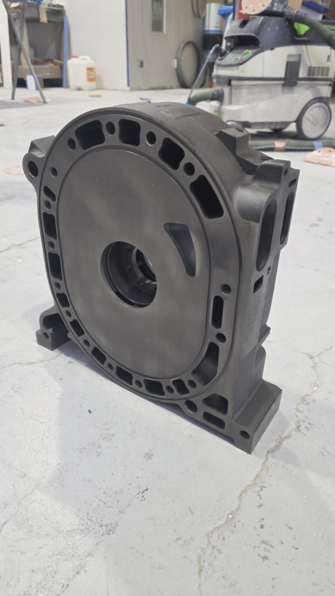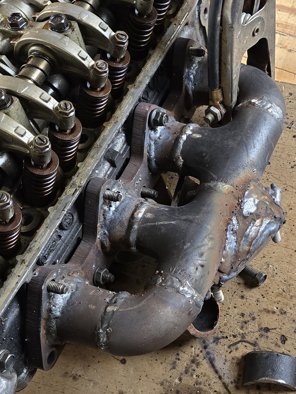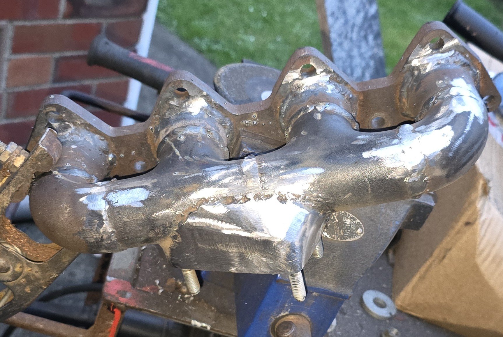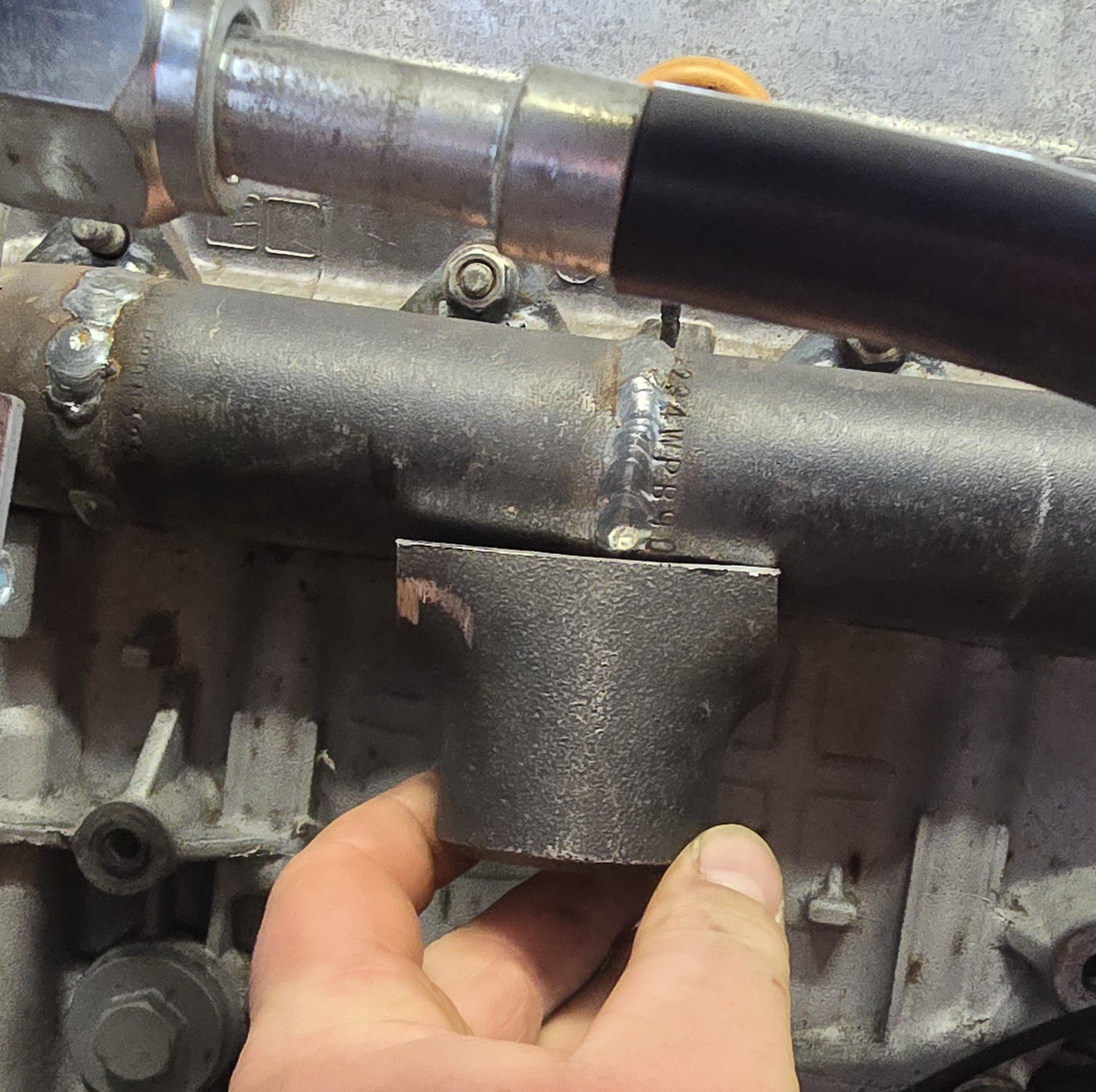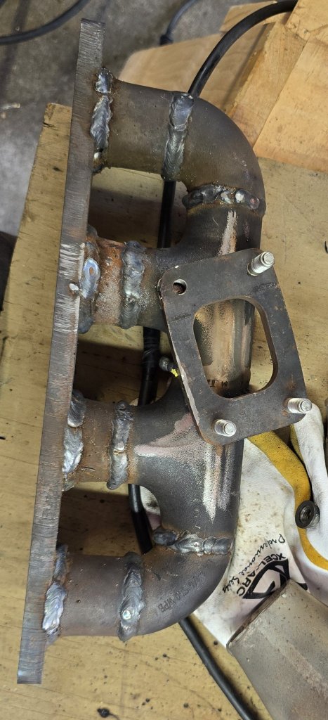Chopped up the tee and had a play with turbo placement Decided higher is better and the turbo cleared the air con compressor better with the flange stuck right on the manifold. (And I didn't have to wait for the other flange to arrive) That left a bit of a gap to try and make something nice to fill Had some ideas about chopping bits of tube to suit but nothing worked. Since all the cool kids are 3d printing stuff I got my metal 3d printer and made up a adapter Yes it's ugly (no I'm not showing the inside as it's worse) It's less bad after much grinding1 point