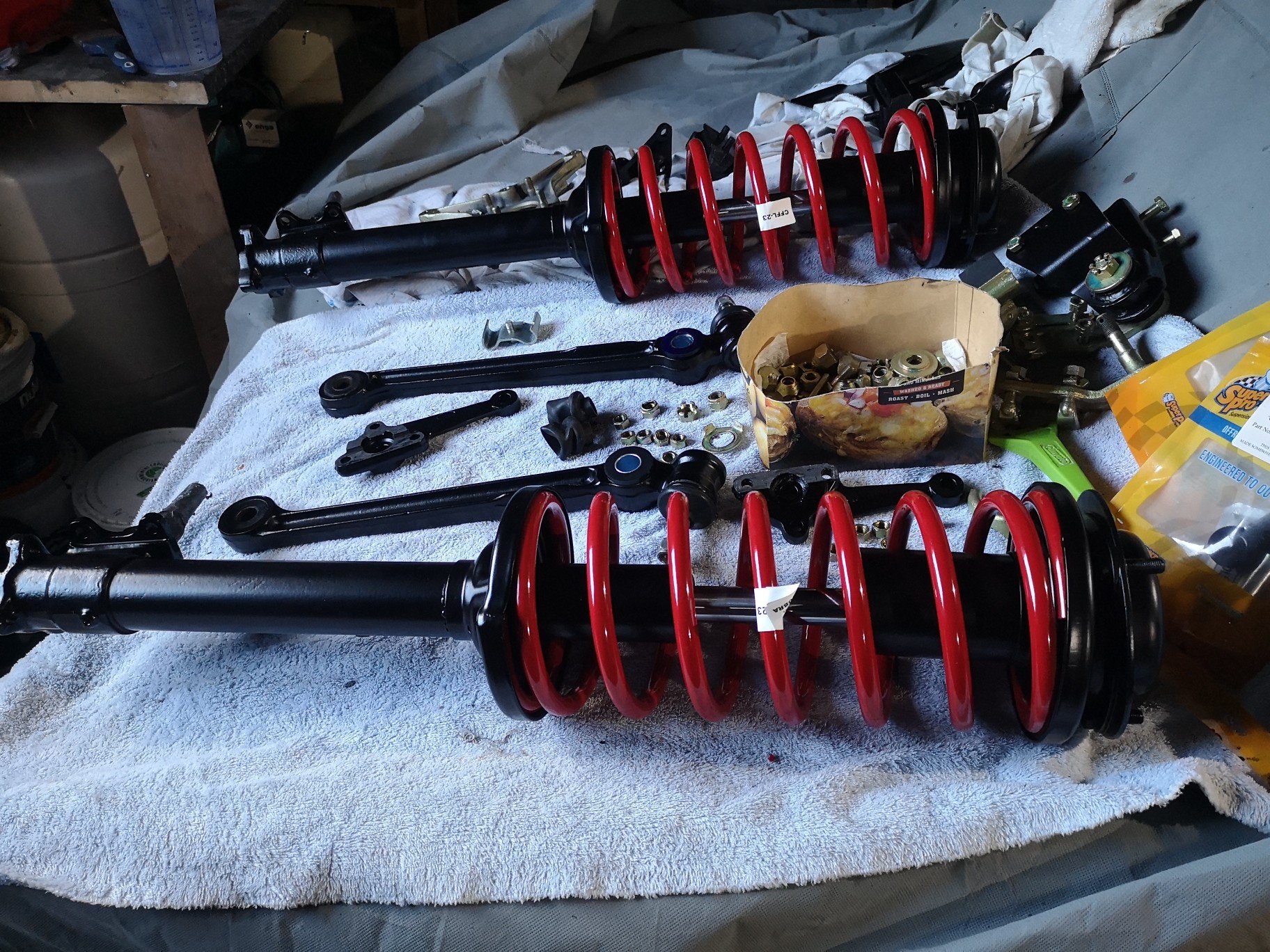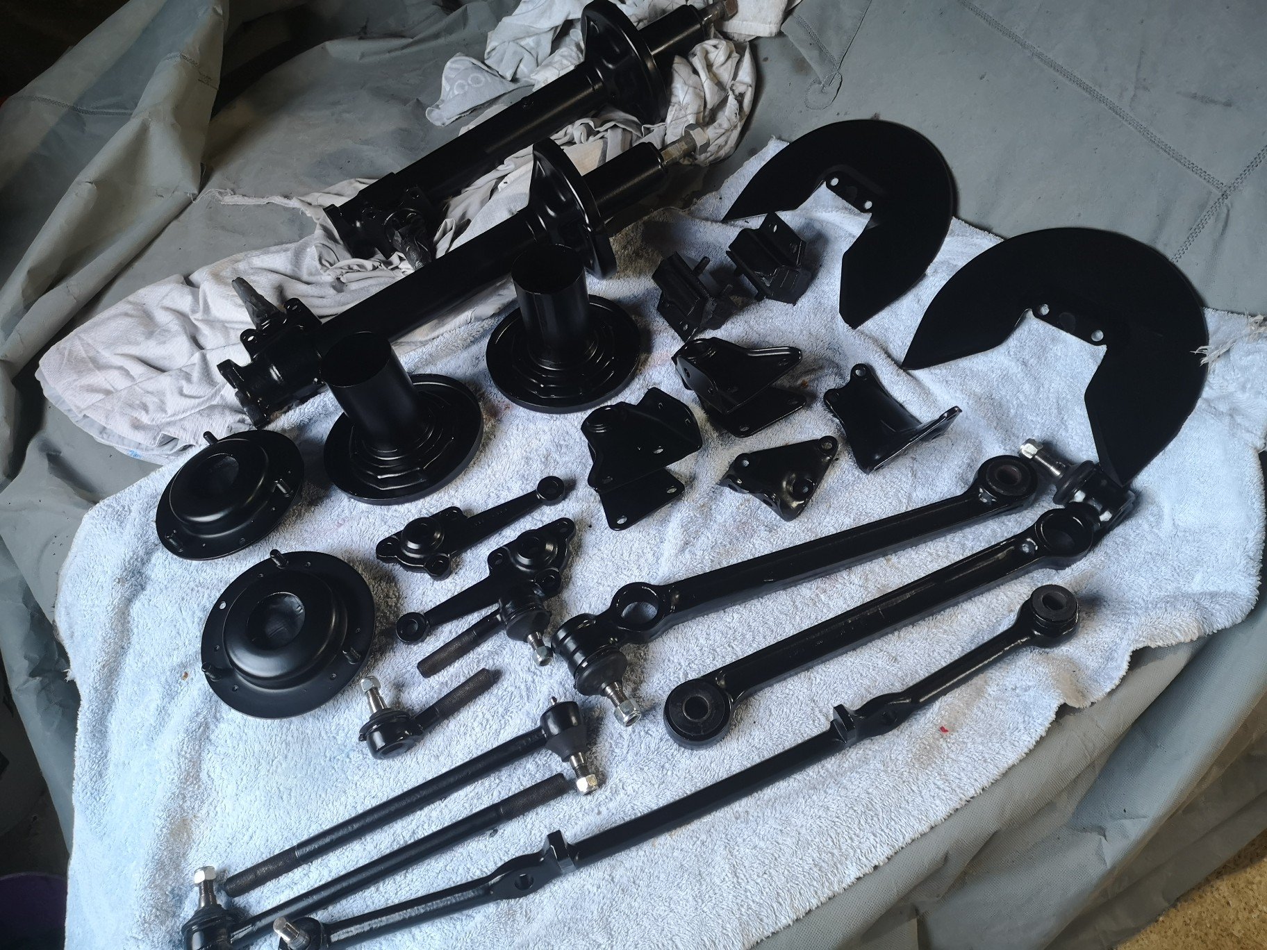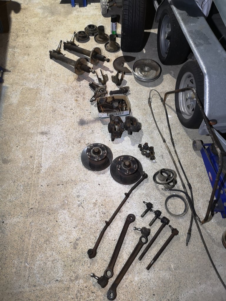 Sheesh.. Well over a year later. Anyway, about a month ago I finally got around to painting all the bits I had blasted in may last year, had them all in bags with damp proof in them so no rust, just had the cross member cleaned up in the last school hols and the last of the bolts etc plated, kind of wish I had the car cleaned underneath before I started, that's a past me vs future me discussion for later.. Some pics.. Was surpass how long it took to paint everything, but I guess it was two coats wet on wet epoxy and 2k chassis black.. . Struts assembled, also took a while to figure out where all the bits and bolts went 15 months after pulling the all apart. Looks a bit blingy and I may still paint some things black (but prob won't), I have it on the ground at last, just need to do an alignment and bleed the brakes etc, speaking of which, had the calipers sleeved at CBC for about 200 each, New handbrake cable for about 120, and the most expensive bit was the ball joints, tie rods not to bad but the control arms were about 400 each.. Should outlast me tbh, I doubt this will do another 100k in its lifetime. Sits nice and low now, just got to get over the hill so @yoeddynz can build me an exhaust then it's wof time, first since 2016 I think..