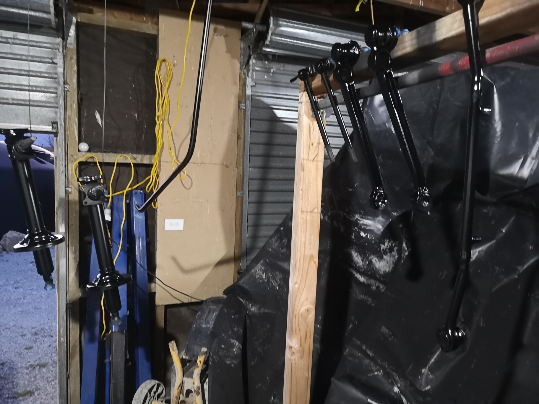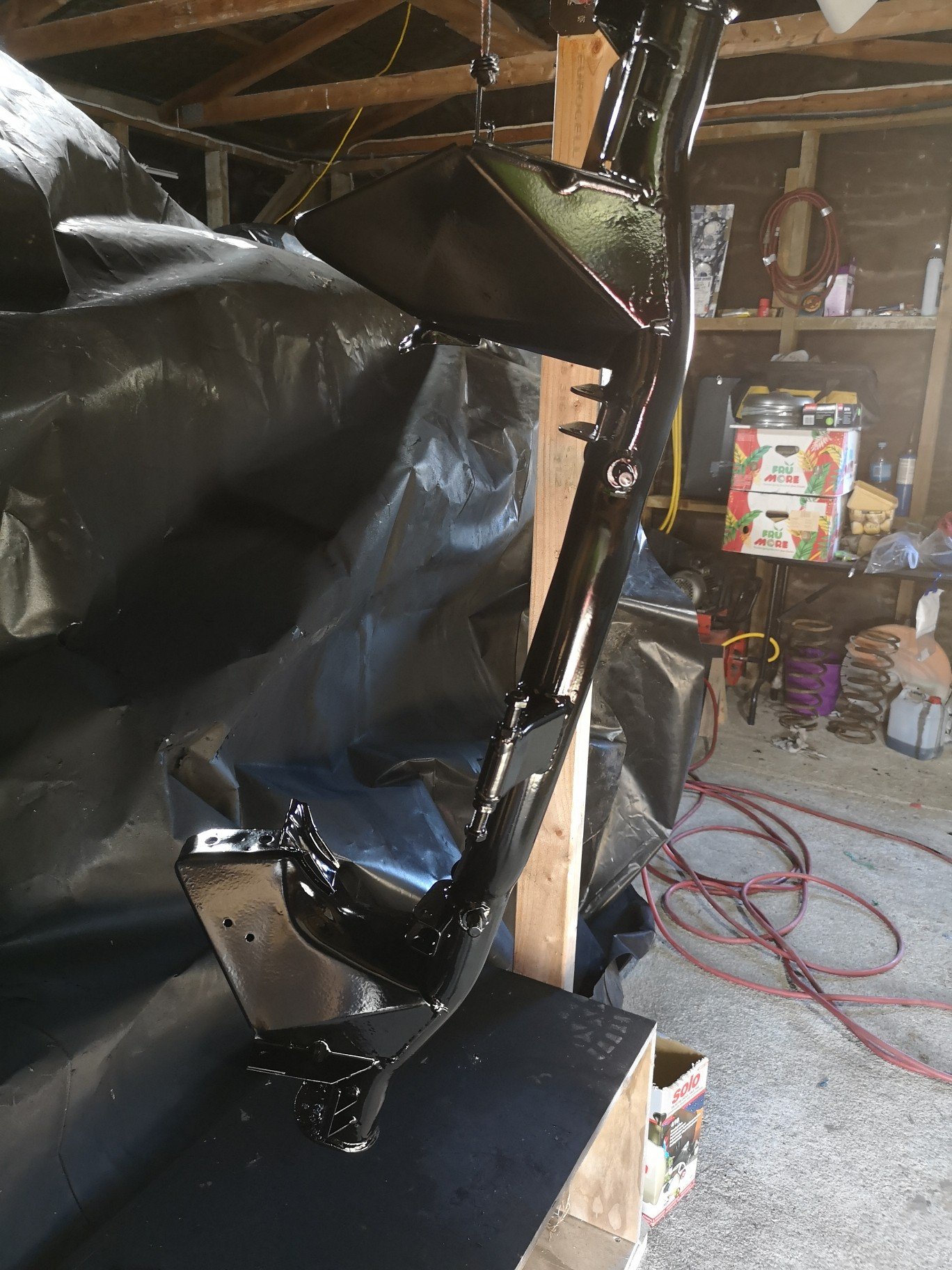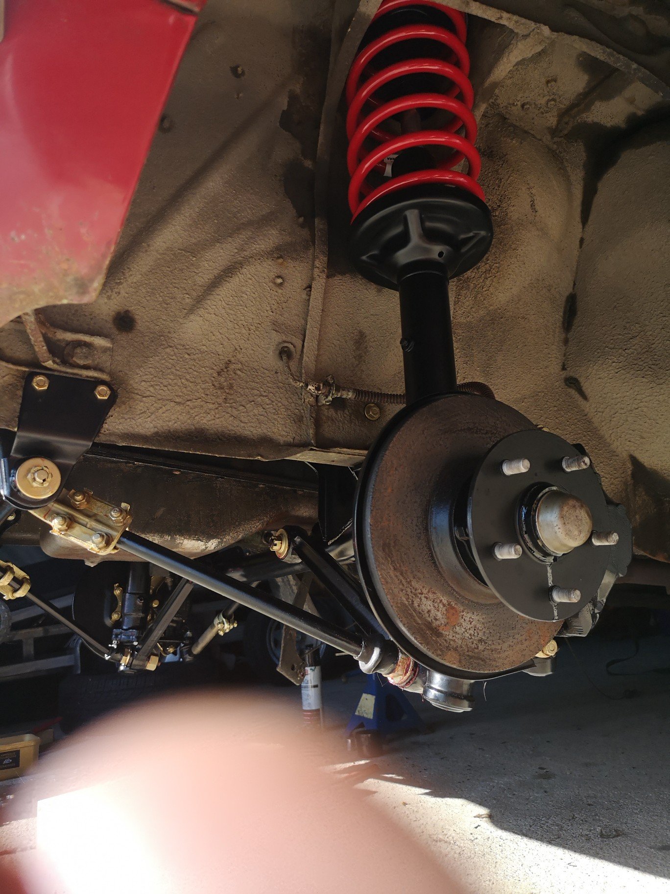 Sheesh.. Well over a year later. Anyway, about a month ago I finally got around to painting all the bits I had blasted in may last year, had them all in bags with damp proof in them so no rust, just had the cross member cleaned up in the last school hols and the last of the bolts etc plated, kind of wish I had the car cleaned underneath before I started, that's a past me vs future me discussion for later.. Some pics.. Was surpass how long it took to paint everything, but I guess it was two coats wet on wet epoxy and 2k chassis black.. . Struts assembled, also took a while to figure out where all the bits and bolts went 15 months after pulling the all apart. Looks a bit blingy and I may still paint some things black (but prob won't), I have it on the ground at last, just need to do an alignment and bleed the brakes etc, speaking of which, had the calipers sleeved at CBC for about 200 each, New handbrake cable for about 120, and the most expensive bit was the ball joints, tie rods not to bad but the control arms were about 400 each.. Should outlast me tbh, I doubt this will do another 100k in its lifetime. Sits nice and low now, just got to get over the hill so @yoeddynz can build me an exhaust then it's wof time, first since 2016 I think..