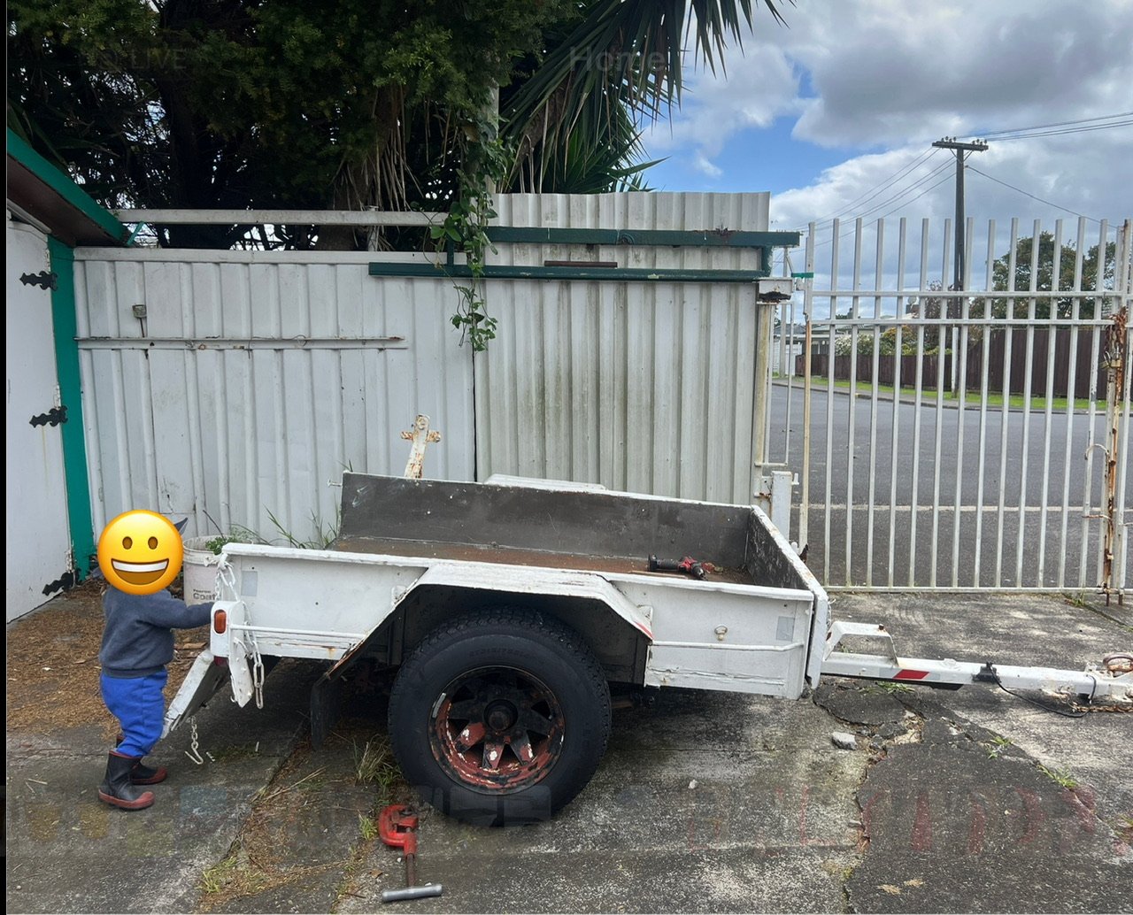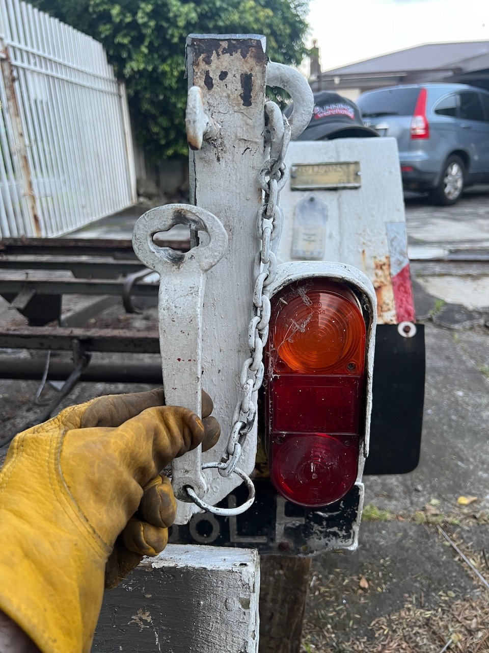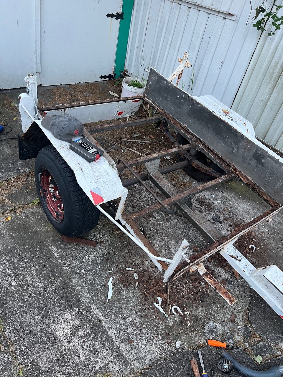 Grandad passed away start of last year, one of the things I’ve inherited is the garden trailer he built in 1966. It’s just a trailer but cool points are OG black plate and sentimental reasons. I had tried to get a WOF on it a couple of times since it expired at the start of the year but it’s really a little too bubbly in some spots, the paints pretty thick from all the years of touch ups and it’s probably 10 months is getting a bit past it for running tip runs with no WOF, so biting the bullet and pulling it apart for a tidy up. Drilled rivets holding the metal floor in - which was covering a sheet of fairly rotten plywood. Plywood sat under the folded metal sides. Has rusted out the lower edge of the sides and the frames pretty flaky. Front edge of the floor was welded to the frame and the sides were welded to the uprights front and rear. Got to this point Sunday afternoon. Hoping to get the other side off this week and then drop it to the blasters and see how much of it comes back… I would really like to find another pair of latches the same as this to fit to the front gate and some similar looking LED taillights to these Lucas ones for ease of not having to deal with cleaning corroded bulb mounts every WOF. Any clues please let me know.