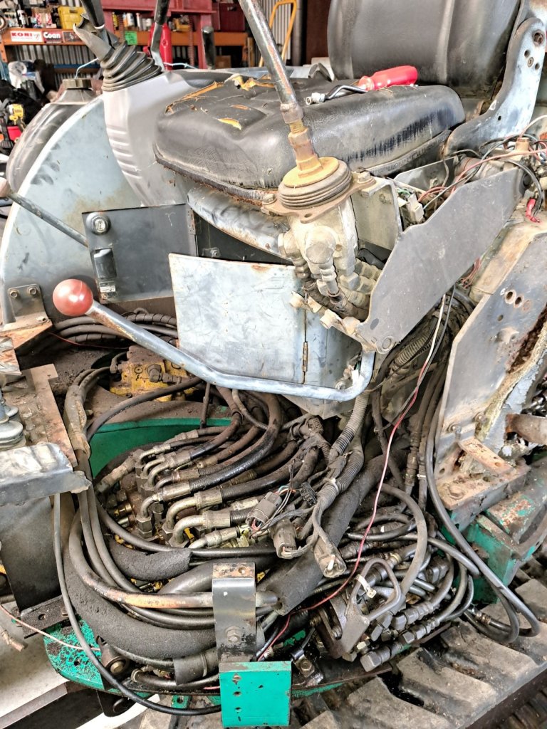 This is my Komatsu Digger. It's a 3 tonner of (probably) 90's vintage and has done unknown hours. It's in worn/well used state, is still operable, does not use water or engine oil ... but does leak hydraulic fluid (and possibly diesel) underneath from places, has worn broken plastic covers, dented steel covers - and is in over all poor (unloved) condition. I have need of an excavator to do work on our little block. My intention is to fix/maintain/use and modify this machine to suit me and my needs. I have allocated a park space in another shed where this park. It has a lower roof than my workshop so in preparation for this I removed the ROP's. Our block is flat and I will not be getting up to anything freaky. It's not going back on. Nek trick will be removing the counterweights. Everything's fucking hard when there is only one of you and you're old. My intention is to strip this down as much as possible yet still keep it mobile. I want to be able to shift it outside so i can clean it to allow me to see what I'm actually fucking with in terms of leaks and broken things. Fuck me ... there are obviously tricks of the trade when it comes to fucking with these things. I have a question though. I want to rip all of the existing wiring out from this machine and replace it with a basic push button starting, and charging circuit. I would plan to incorporate the factory start/inhibitor switch with the addition of a main battery disconnect. Race car style. Fuck all but simple and reliable. I plan to run 3 mechanical gauges ... water temp, engine oil pressure and hydraulic oil temp. Everything else has sight glass or dip stick. Question ... do the hydraulics on something this old have any electrical sensors (or anything) that hook into the factory loom? I've looked and can't see anything. I have not got a manual, but i thought with something this old there'd be nothing like that. Anyone know? This project is slow time for me. I know what I want (a rat excavator, lol!) at the end of it - an older machine that is mechanically sound and reliable ... looks not so much.