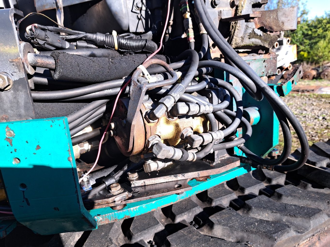 Right! More progress. I got the counterweights removed. Heavy fuckers. There were two of them weighing a total of just over 600kg. This is the 400kg one sitting on my cross country little arsed trolley I made for carrying heavy stuff across my metaled driveway. Handy as fuck. Made from Honda (or Nissan - can't remember) rear beam axles. One day I intend to own a tractor but until then this will have to do me. Clean as! Used engine degreaser followed by prolonged steam cleaning. Made a mess of my driveway but in a spot that gets used for nothing. Also thought ahead and placed a piece of scrap sheet down underneath to zero in on the leaks. So far i have identified 5 major leak spots and am setting about identifying in detail what needs tightening, replacing and or something else doing. This nek pic is a source of one of them. This yellow thing with all the hoses going into it. Does anyone know what it's called? The hoses are all from the hand control joy sticks. I have not got a manual and the online schematics I can find confuse the hell outta me. Anyone know the name of it? So I can further discuss with a local workshop what the best course of action might be. It's leaking around the end join between the end cap and the barrel of the body. This leak is one of my major ones that drip directly onto the rubber tracks then down onto the undercarriage which shits me.