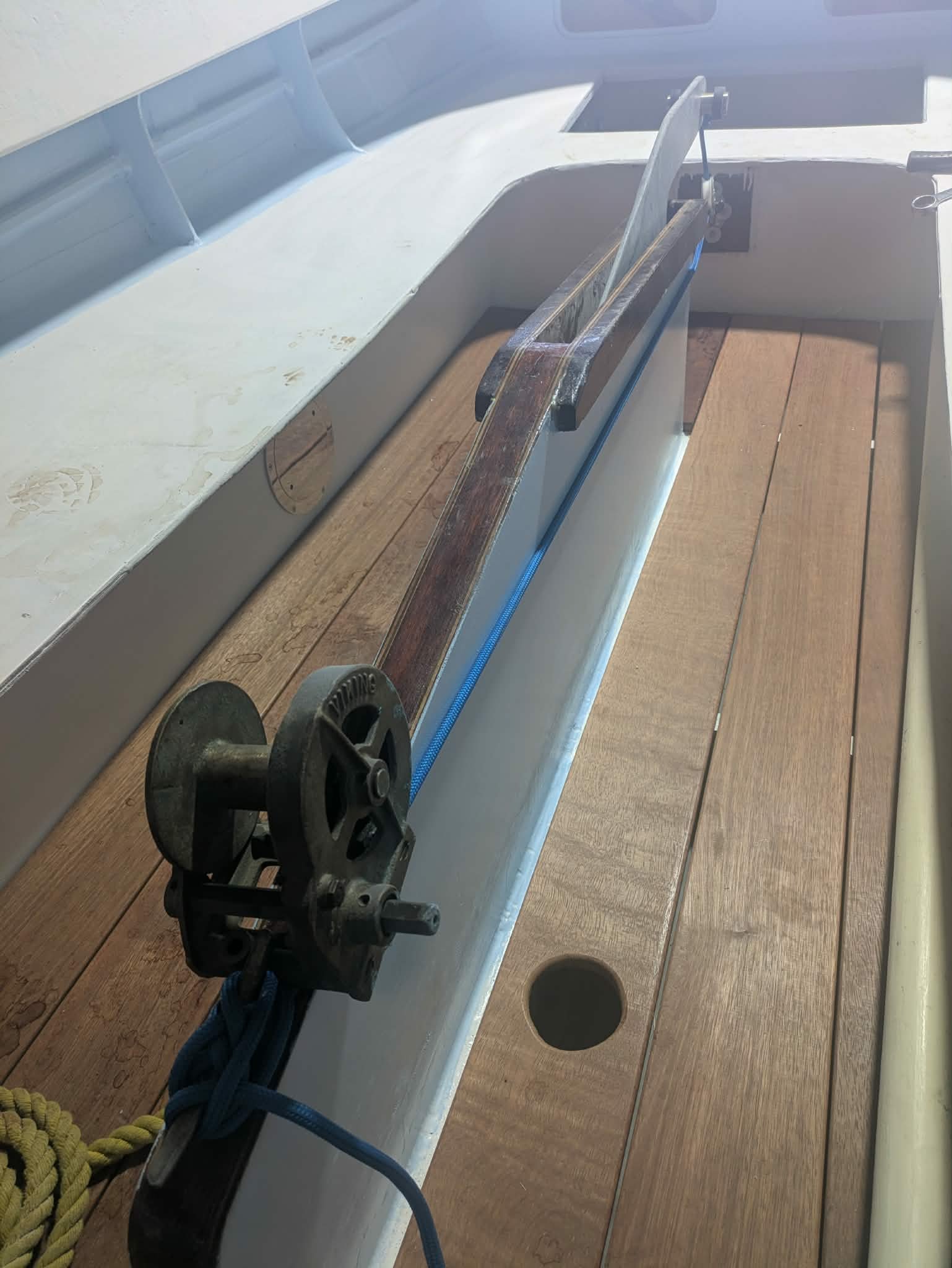 So I was pissfarting about with the centreboard today. The rub rail on the skeg was making it a pain to get it all the way out. So a little trim with the grinder sorted that out. Problem now is I have a single row pulley and the only way I can get the centreboard back up is to put my foot on it to kick it down and then tie it off. That isn't practical. I'm trying to use up what I have rather than spend more money so need to come up with some options. I have a small winch that could possibly work. Should be fun on the old knee/shin.