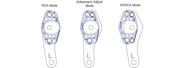 Correct. The basic NCRCA has a set of through holes and a set of threaded holes to offset the balljoint and steering arm by your chosen offset. With the "Evolved" ones, you can use either the through holes, the threaded holes, or a combination of the two to cancel out the factory ackerman: I reckon you could design a custom version of the evolved style with extra offset, then make a new steering arm (or swap the arms from side to side?) to account for the rest of the difference you need. -