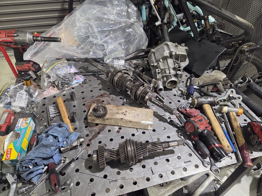 Coming up on this season of Markku's Driveline Adventures: J160 Gearbox disassembly. For the last few events, I've been really struggling to get gears. Particularly getting down into 2nd, but it's also been crunching up into 3rd and 4th. Missing 2nd gear and then bogging through 3rd lost me a few a positions at the last round of racing at Highlands and I was getting super frustrated trying to find gears, so it's time to sort it out! I have a spare gearbox that I swapped out after it started to get rumbly at oldschool nats 2015. The plan has always been to rebuild it so I have a good spare, but it hasn't been an important job until right now 😅 So I downloaded the full J160 service manual and proceeded to pull it apart. You can download the full PDF from SQ Engineering (at the bottom of this page: https://www.sq-engineering.com/tech-articles/wiring-diagrams-and-diagnosis ). As I was taking things apart, a few little bits appeared from the oil. I think these are piece of bearing cage... Once I got the counter gear off, it was pretty easy to see where the rumble came from: A few of the rollers had completely fallen out of the bearing and it's chewed up the counter shaft. The rollers run directly on this surface, so I think this shaft is toast unless I get someone to hard face weld and machine it back to size Note to self and everyone else: if your bench has holes in it, put a layer of cardboard down! It take ages to find a roll pun when they fall down there! I think the shaft is too far gone, so will get Dad to raid my parts gearbox in Palmy for a counter shaft and a couple of other bits so I can get the box rebuilt in time for the next round of racing on Feb 28th. Having a parts hoard comes in handy sometimes [often].