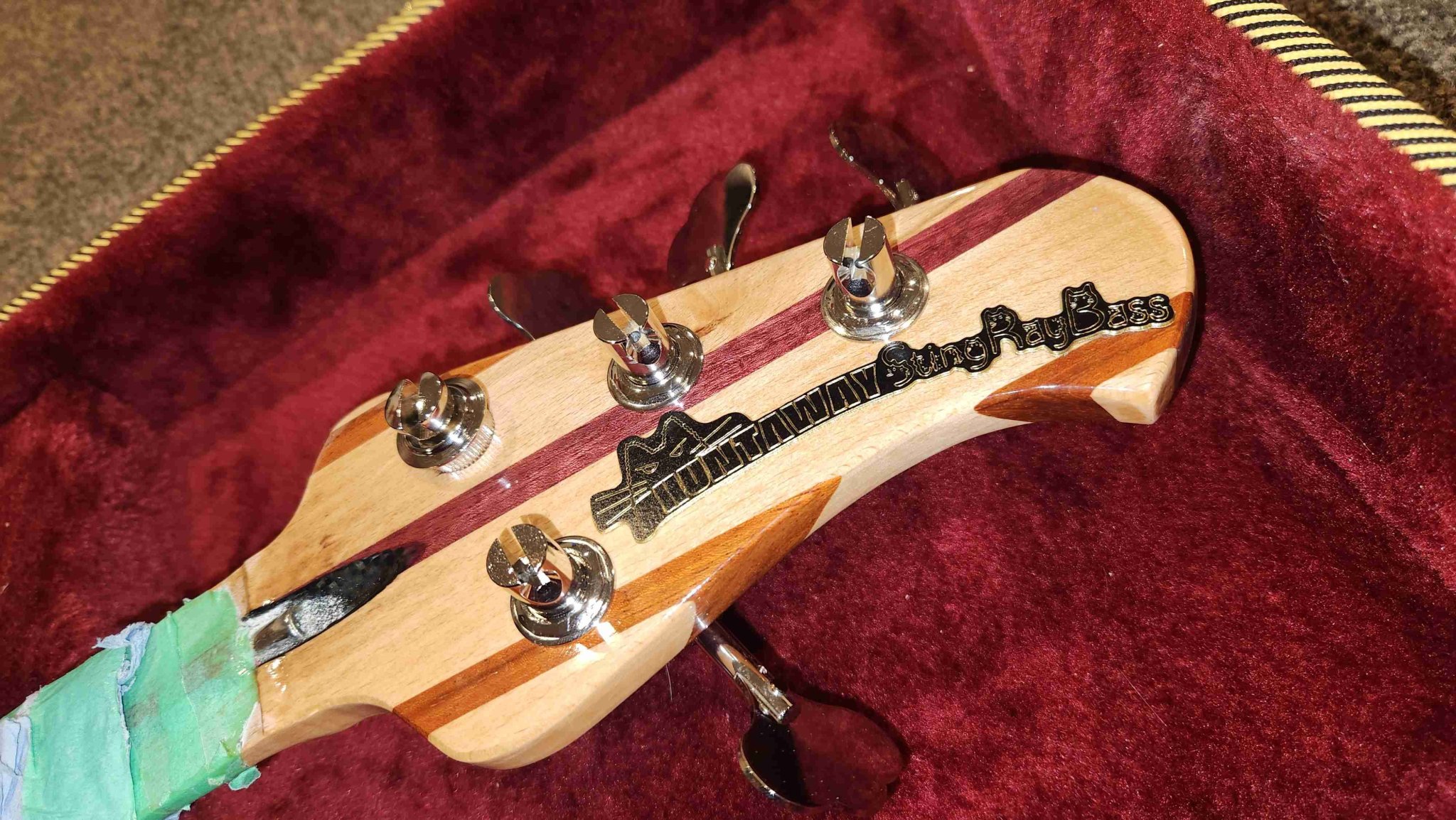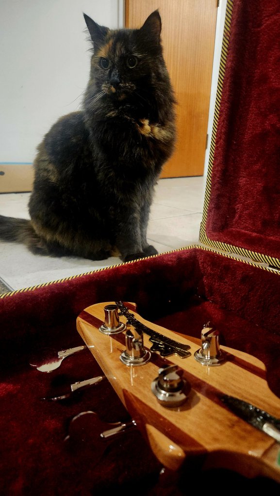 I can offer a slight teaser with this photo of my cat, the logo inspiration, sitting near the headstock. She usually looks angrier so I must be doing alright.