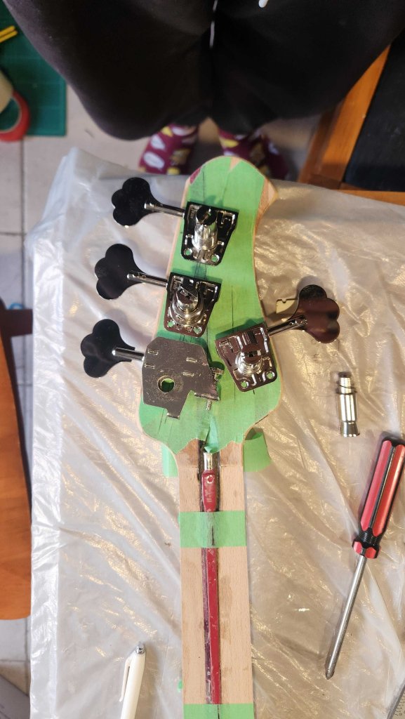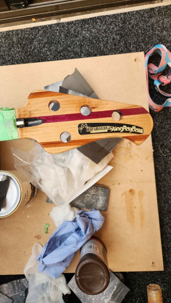 I got to the below point and was feeling pretty happy, i sent a pic to a good mate whos a painter in the airforce and a good guitar player, who crushed my dreams by informing me that it still wasn't done. he suggested i go look at my wifes squire strat (a good, but entry level guitar) and to come back and tell him if i saw anything but a perfectly flat surface, i didnt even need to go look because i knew that guitar was amazing, so he said my bass should be atleast as good as a squire. mother fucker it took weeks of effort to achieve that, but he was right. So i set to more applications and sanding off and eventually made it here. As you can see there were still a couple of defects which got sorted i think its at an even more polished state now but i havnt got any pics, it will get polished again after i fit all the hardware and then remove it again before final fitment. here it in in its current state with hardware either fitted or dummy placed. getting real excited now.