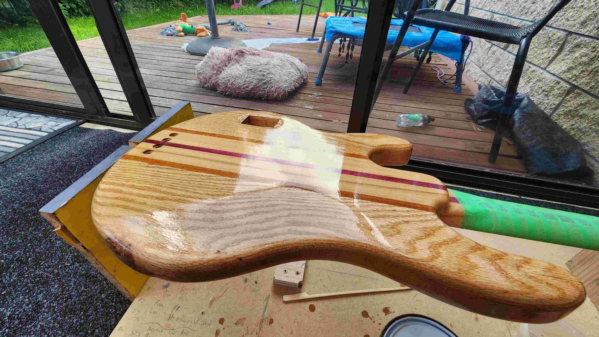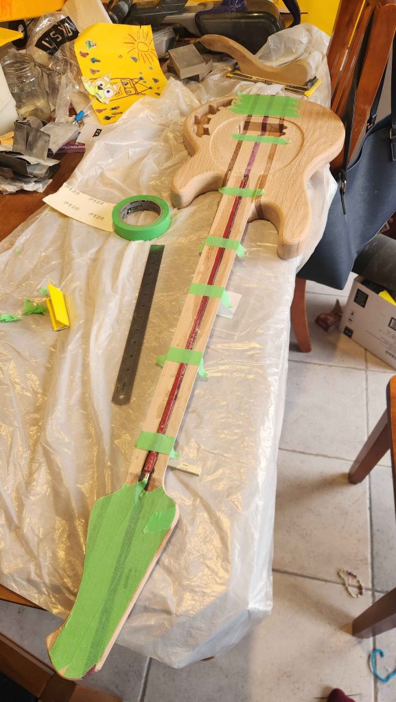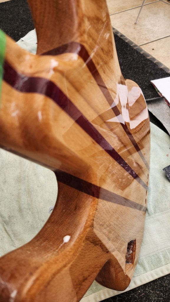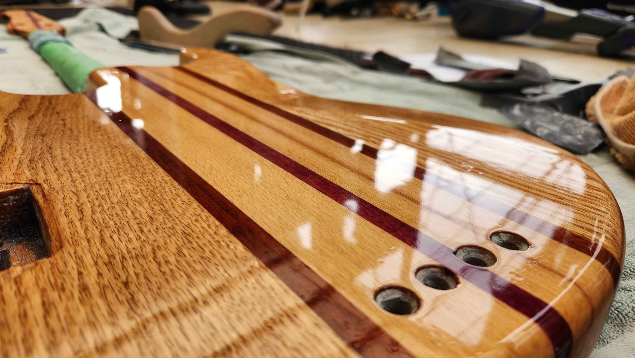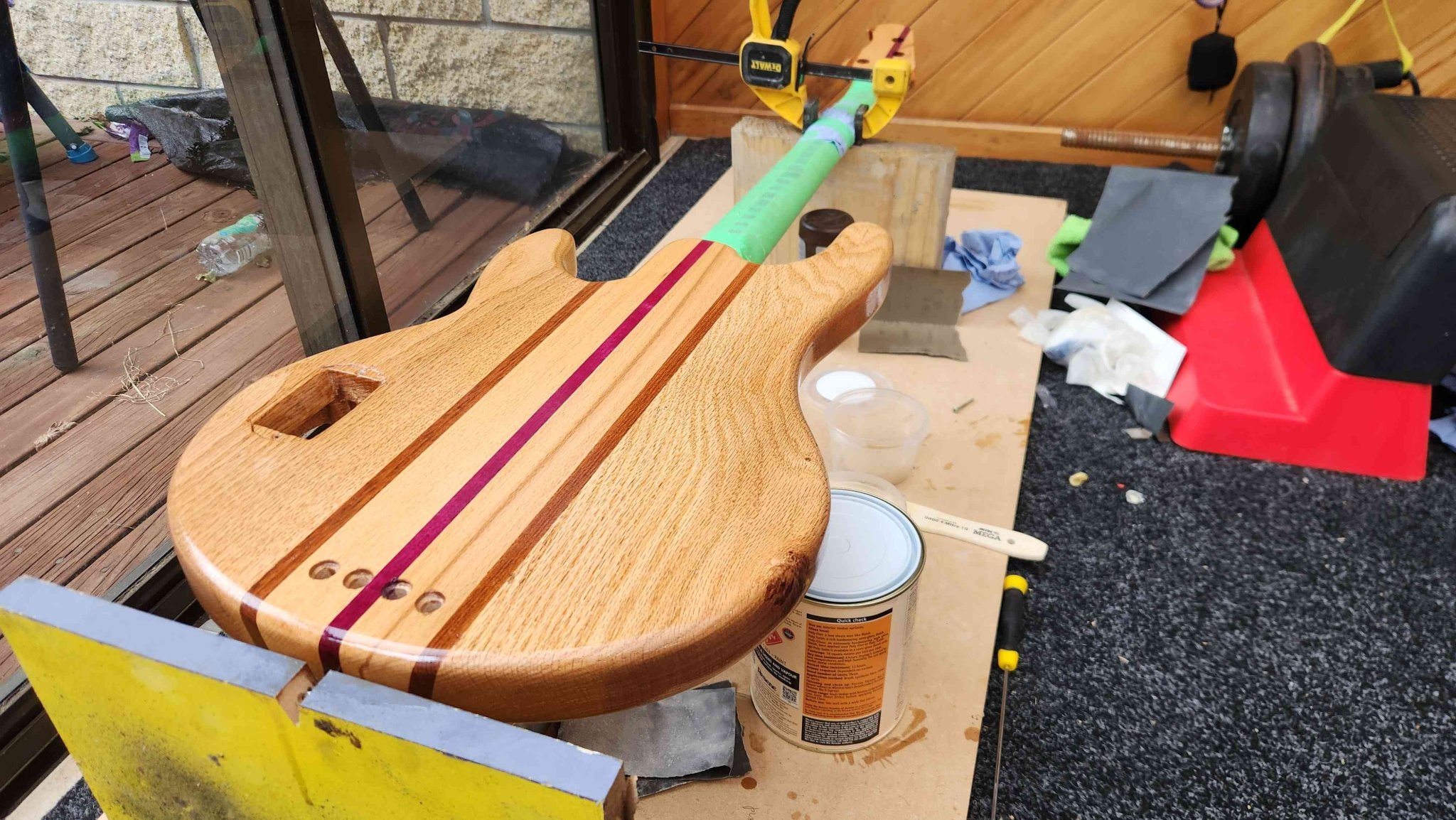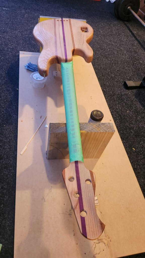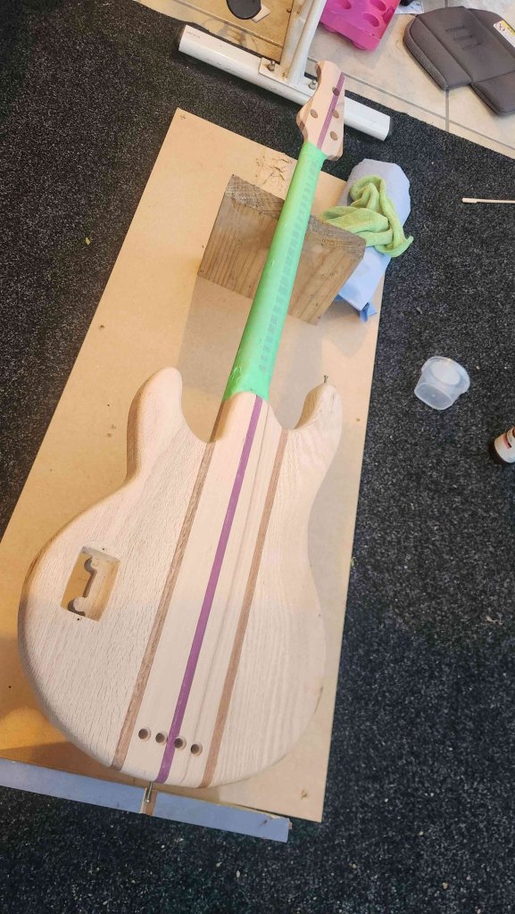 So as shown above i got the best Christmas present ever of a chunk of wood that was shaped like a bass guitar. this fucked nearly all of my other plans for my Christmas break so the house and cars barely got touched as i got stuck into sanding and boy was there alot of sanding, not because the model was wrong or Nicks machine inaccurate, but because i found out why they call hardwood, hardwood My family graciously allowed me to turn our dining table into the most efficient dust production factory you've ever seen and i worked on it most days untill i was happy, it turns out i didn't take any pictures of this untill i started marking things out for truss rod install and tuning machine holes. Once i was happy with the finish sanding i built a basic rack to help with the application of finish. I initially started with Tru-Oil, i gunstock finish product and while it looked great i quickly realized the grain on the red oak was far too deep for this product to ever fill, so i went looking for an oil based polyurethane and landed on Resene Qristal, i picked up a high gloss and a satin with the intention of doing the recesses 'pickguard' satin for a bit of contrast and potentially the neck if i opt not to use the Tru-Oil here aswell. Very happy with the resene product, and que about 50 coats with sanding in between to eventually level off the surface and get a proper high gloss finish, but once done it looked absolutely incredible, unfortunately im not a great photographer so i cant really portray just how great this wood looks. the stripes of purple heart and Filipino mahogany look almost metallic against the soft tones of the beech and oak. Starting to look like something...