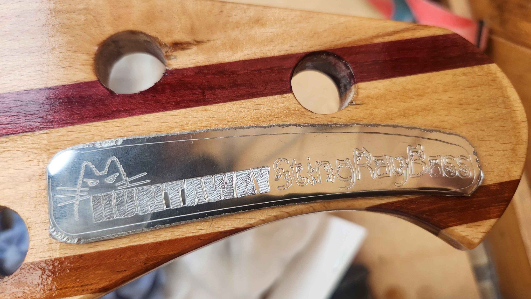 In a stroke of luck (good or bad who knows) i came across some pictures of timber called Macassar ebony and fell in love. the timber matches my cats markings almost exactly. I knew what was going to happen, i was going to put this nearly complete fretboard aside and start again, again (again, again) I didnt actually know how i was going to get some, its a rare species and i was starting to research various import laws ect. Then out of the blue, someone listed a bunch of fretboard blanks on trademe IN NEW ZEALAND already! BUT they were sized for guitar and completly unsuitable. i took a shot and contacted the guy to see if he had any more and he very graciously cut up some more of his stock into 5 different boards that would fit my requirements so i could choose a board thats markings took my fancy the most. Only after he cut them did he ask what the hell instrument i was building that needed a fretboard so long, and i showed him the thumb rest detail and 35" scale bass info ect. As it turns out, he was a somewhat famous banjo luthier who emigrated from the UK to NZ and was happy to be helping people build instruments and offered some good advice. i also now want a little banjo scaled electric bass. i mean i got fretboards coming out the ears so maybe itll happen. You might see the essence of the logo in the above face. I also needed to cover a small error so i made this serial number plate which im very happy with. managed to engrave the stainless on my router which probably contributed to next episodes saga. i spun it up to mach 3 in my drill press and pressed it into some scotch pad which gave it the cool sunburst effect as well as got enough (alot) heat into it to colour it a straw colour that more closly matched the nickel plating found everywhere else. So long story short, ive been hard at work and made zero progress.