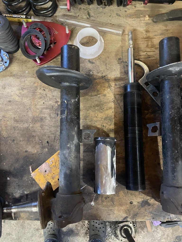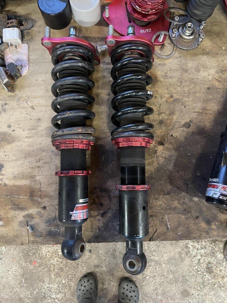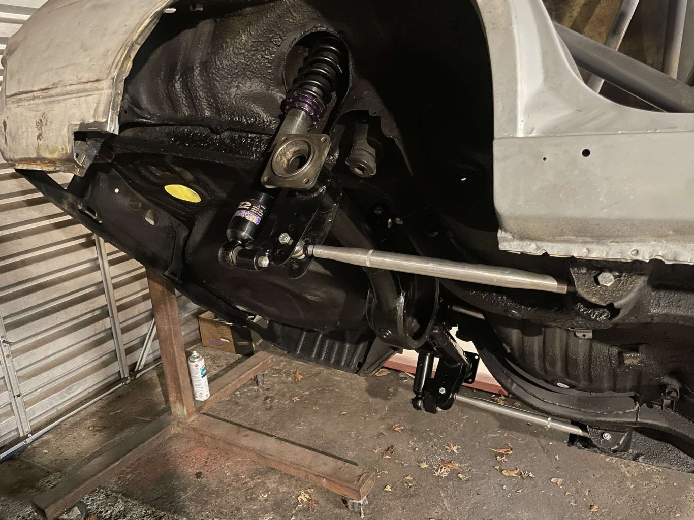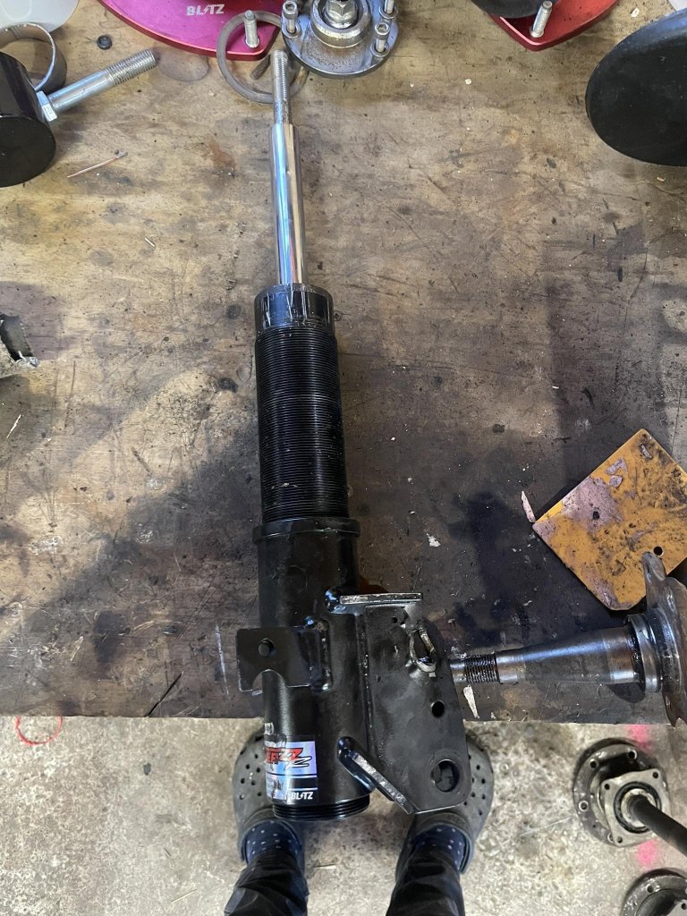 Gave it a lick of underseal and it looks 1000x better, good enough for a race car anyway. Im on a super tight budget for this car, new sprog popped out and better half at home down to one income makes it tough! Usually would sandblast/powdercoat everything but with budget cuts a quick wire wheel and "subframe black" paint worked a treat! With keeping in the theme of cheap parts i was on the lookout for cheap coilovers on market place and these popped up, off a modern Subaru of some sort a set of Blitz coilovers length looked about right and at $150 the price was right. all tidied up cut off all the tabs/mounts on the lower and ill weld them straight the the knuckle. the camber plates are also have enough meat on them to cut down to suit the ke70 bolt patter on the top. One of the fronts didn't come apart easily and a week of penetrating oil, some big bars/pipes and some hammers didn't make it budge.. a little stumped on how to unseize it without buggering it. I might try a air chisel to try break it loose but if not i will have to cut it off to save the shock and try find someone friendly with a lather to turn up a new one with an internal thread for me. The car has turrets welded in the rear to suit s13 coilovers, no holes are drilled so the world is my oyster really as long as the length is right. the rears seem to be about the right length and hopefully not tooo short for the back of this. For $150 if i can make these work i will be stoked.