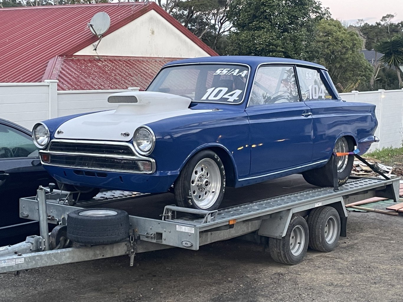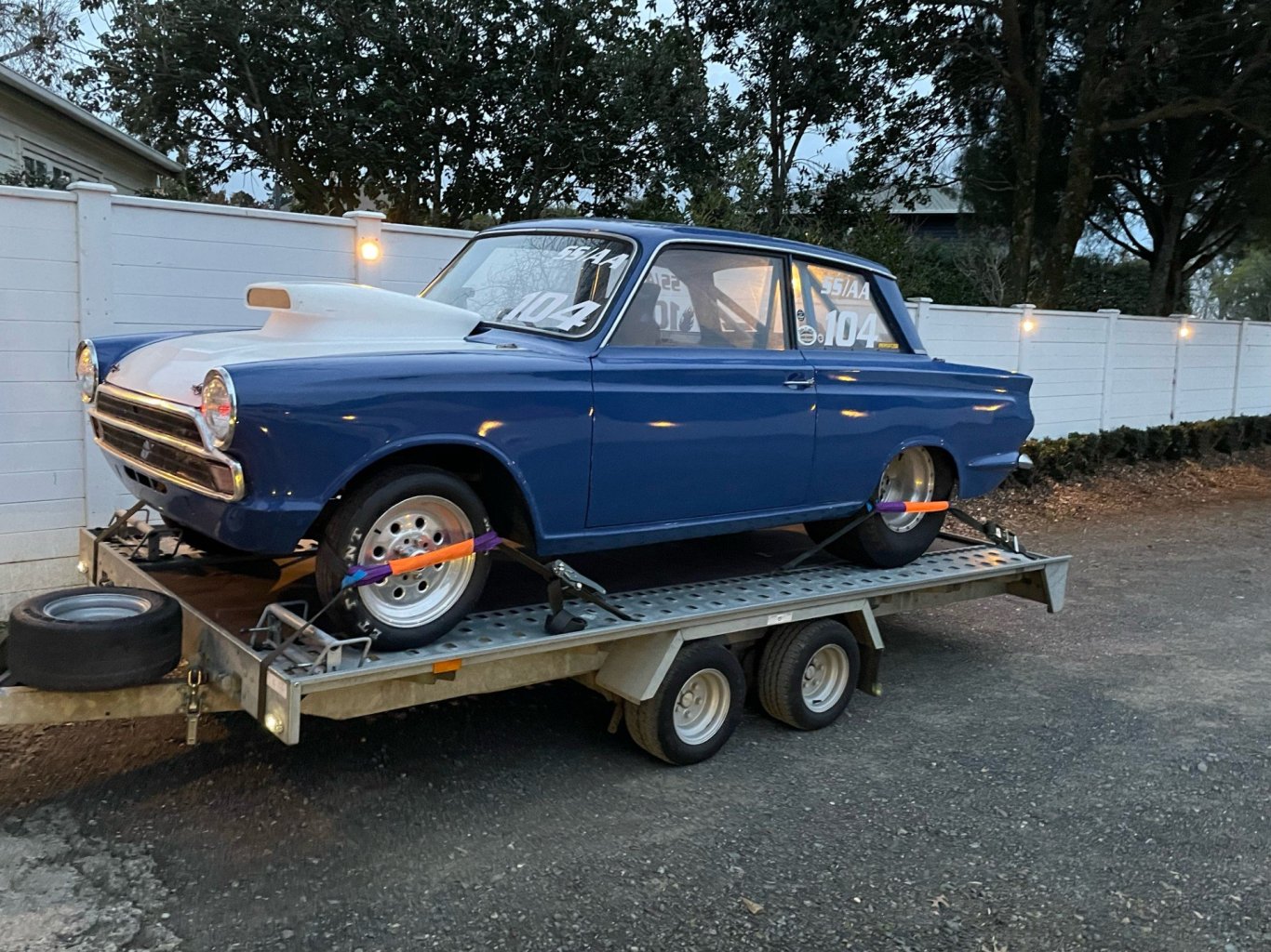 A few more Cortinas in between, and fast forward to beginning of May this year. Trawling through FB marketplace, I spotted this car. It was built in late 1980's, same time I built mine, and current owner was selling it less engine. It was running a 393 Cleveland with around 600hp, with a 150 shot of Nitrous. He had run a best of 9.0 @ 150 mph, not bad for an old Cortina! I went to Papamoa straight away to view the car, paid a deposit, and collected it on Saturday last week. I haven't decided exactly what I am going to do with it yet. It was deregistered when it was turned into a drag car, so I am going to investigate making it road legal again. Would be fun to drive to car shows, or nip down to the dairy for milk! If that proves too difficult, then it will stay as a drag car only. Either way, I would like to go drag racing, so focus will still be on keeping it primarily as a drag car. Engine is TBC, although most likely a V8. It is very well built, and has some good parts fitted, half chassis rear, big tubs, very short fabricated nine inch with Strange 35 spline shafts, brakes and double adjustable shocks. Weld wheels 15"x12" rear and 15"x4" front. Front suspension is Ford Escort Gp.4 style struts, with Escort rack, rear end is ladder bar. A few pics of the car racing, and prior to engine removal, and then on the trailer after arriving home on Saturday.