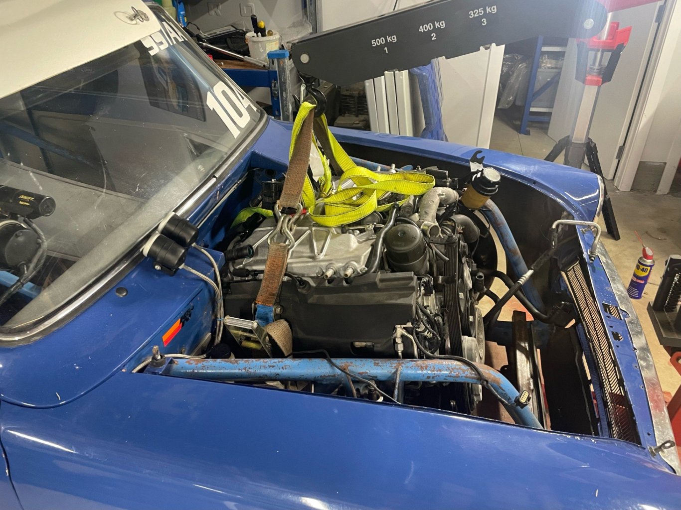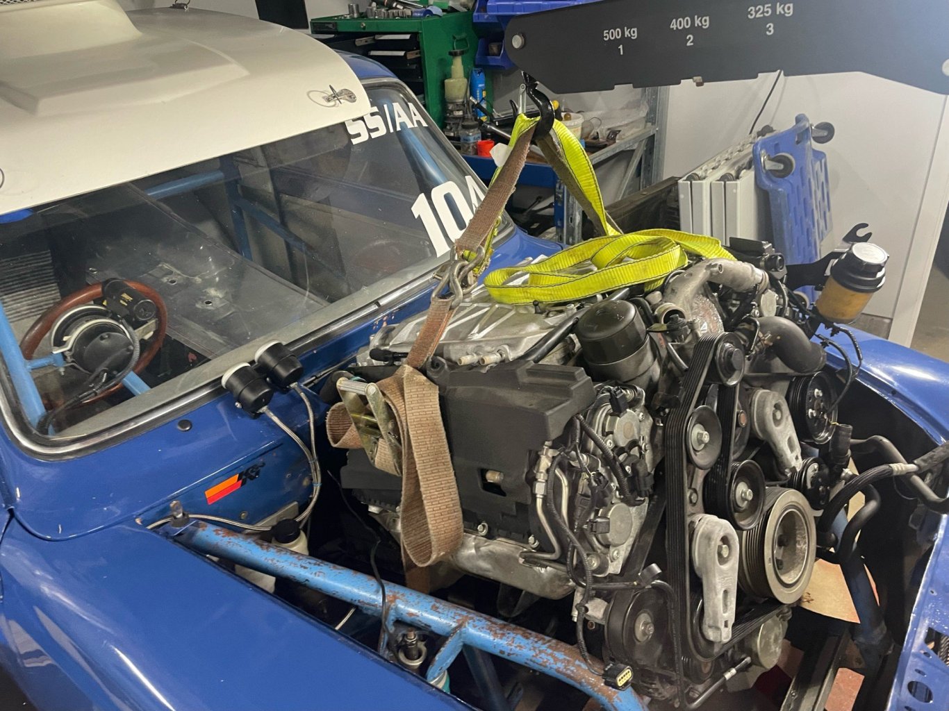 had a few spare hours the other night, so thought I would see if the spare "Ford built" V8 would fit. After a bit of lifting, craning, pushing and shoving, removing a few parts which were in the way I got it most of the way in. Sump would not go down past front crossmember, so will need to remove that first, lift the car on stands, then try again. Looks like it will fit without any surgery though, so that's a plus. Should have got a bigger shoehorn. It's off to Cletus in a week for a "pre-certification" inspection, and that will help me decide if I want to make it street legal again. Lots of ugliness has been uncovered, but it is mostly small shit that is fairly easy to sort. As long as there aren't any large fundamental changes required, such as remove the rollcage and do it all again, then I think we will be okay. Fingers crossed!