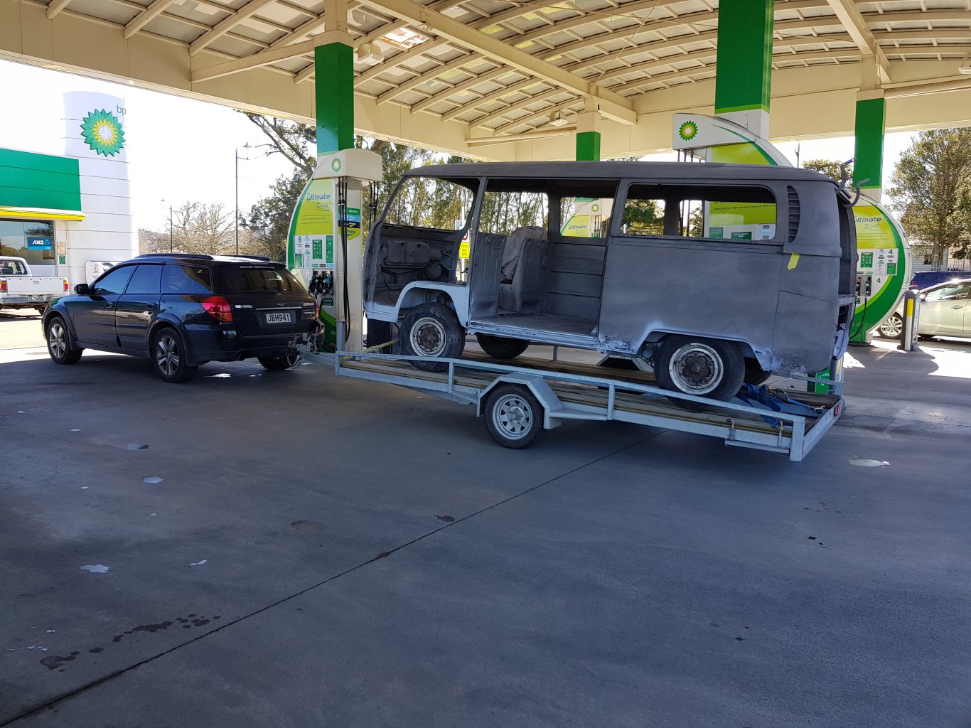 Well it all started with getting along with the guys at the vdub shop. They had the low light there for a we while had been stripped and sand blasted. The owner was been hard to contact and wasn't doing much. I made a silly offer and got no where. In the end they wanted it gone. Several emails from me to the owner ended up no where. Aiden and I had been talking at the vdub shop trying to help him get it out of his way so he emailed saying sorry we have had enough and have pushed it out side. Saying good luck with the sale it's just going to rust. I then got a email back from the kombi owner saying sweet we have a deal you can pick it up when ever. Meanwhile aiden hadn't put it out side was still in side. Anyway picked it up today. This is pretty much beths kombi as I'm not aloud another car. Got to many bills to pay. She had been sitting a while in the same spot collecting some dust. Token petrol station picture of the new car. And now I collect rusty volkswagens in my spare time I had priced up all the patch panels before going in with the deal so this shull be fun. I also have to finish my valiant before I can start on this. We will see how that goes. Chat about it over here
