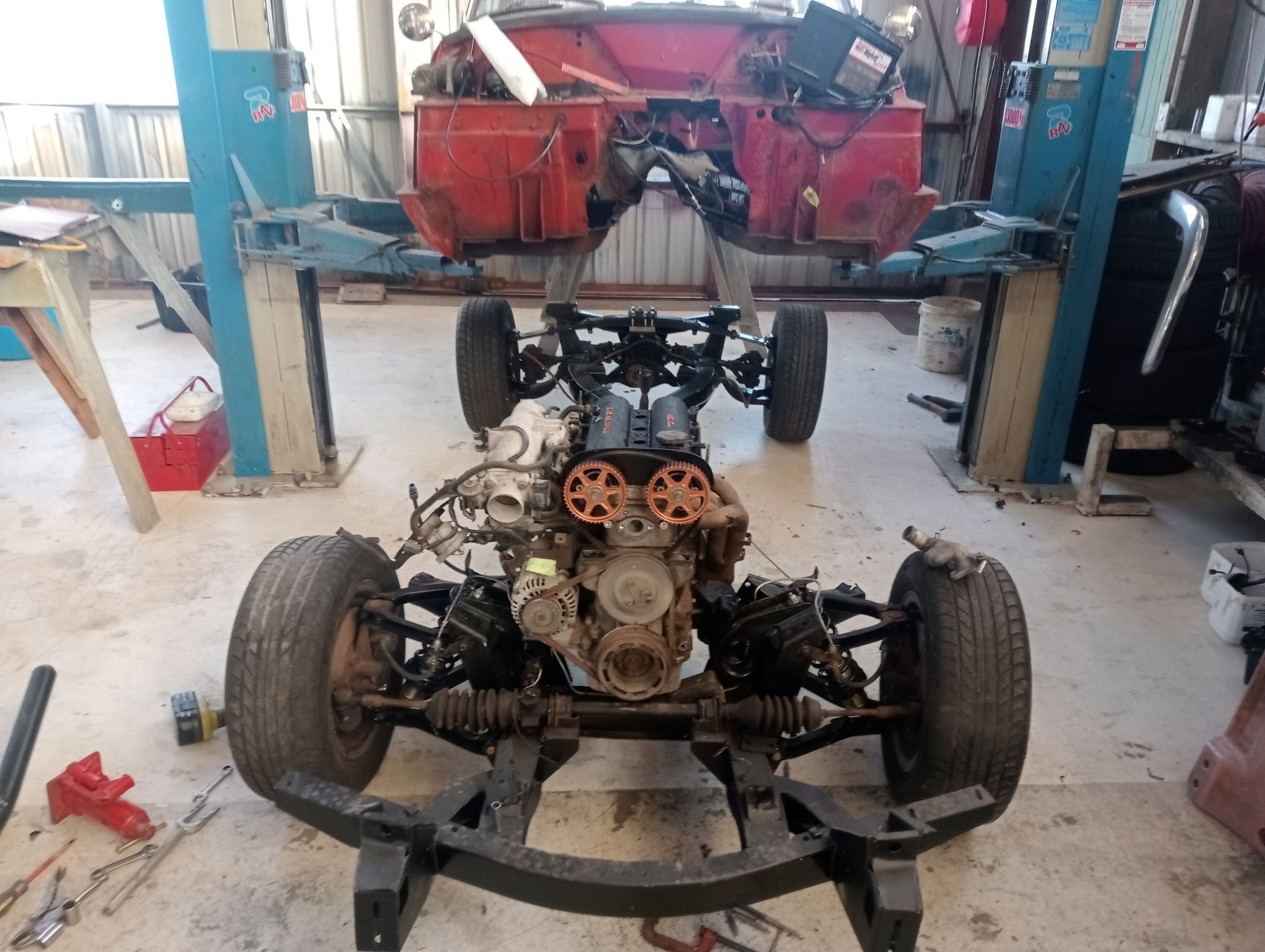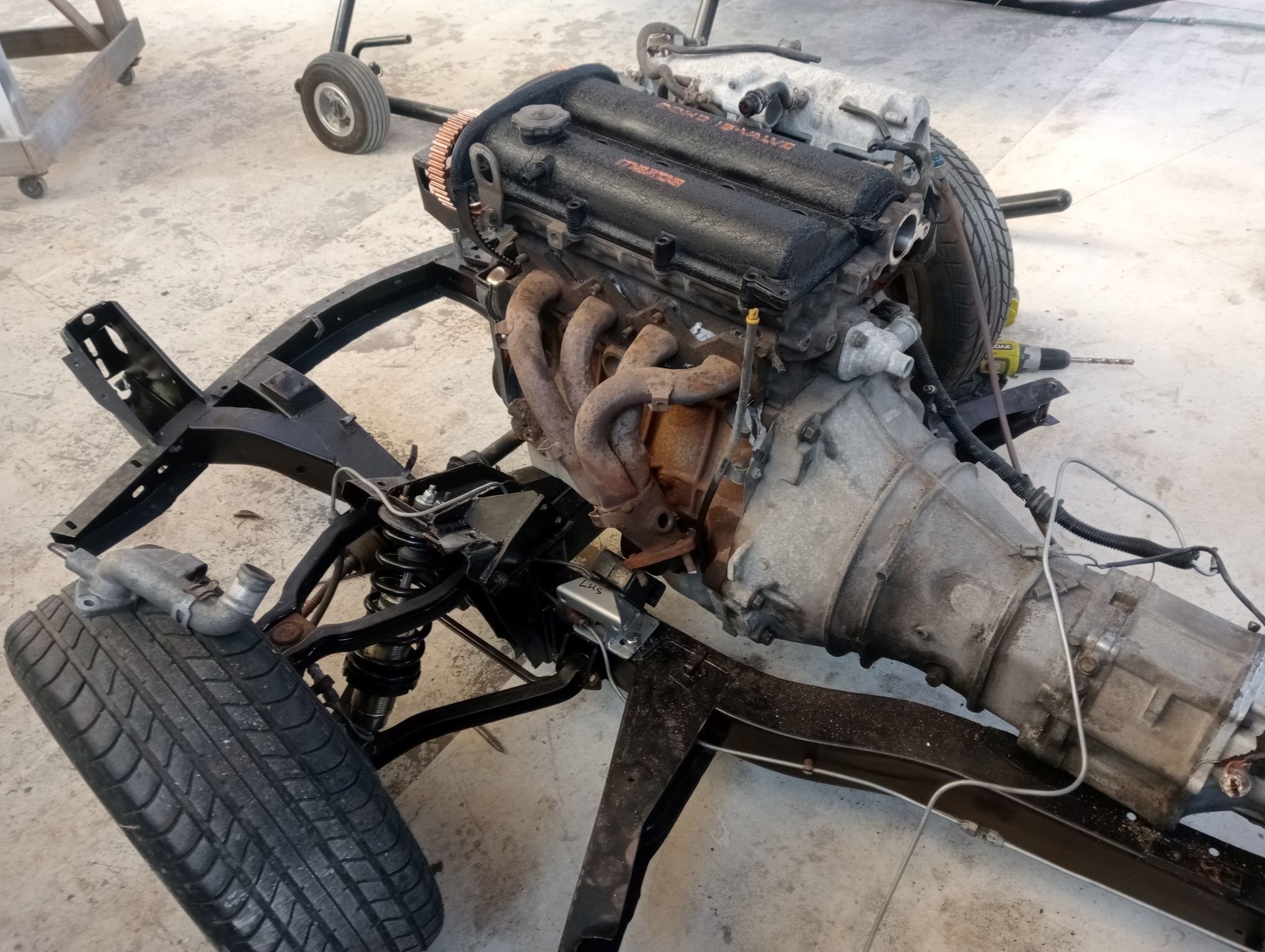 Popular Post gibbon Posted June 18 Author Popular Post Posted June 18 the engine plonks on and sits between the strut towers pretty good. the stock engine mounts are no good as they cater to two nonexistent cylinders. This pic has the engine rotated a little too far, it needs to be pretty flat to clear the bonnet as of the mounting plan at this time of writing the mx5 gearbox has some major alloy hanging off the side that needs to be dealt with as it fouls the frame. as far as I know any early rx7 tail housing will bolt on but I value money more than time at the moment so I just laid into it with a grinder and buzzed it all off. otherwise the clutch slave seems to clear OK and aside from a wee bracket on the other side, there are no clearance issues with the chassis that I can see With the initial "I just want to drop the engine on it and take a photo" frivolity out of the way I stripped everything off the chassis and carefully documented everything into piles of bits on the ground and piles of bits on various tables. I misplaced all my tools but some of the other guys were away so I borrowed theirs and misplaced them too. The chassis has a few cracks and the outboard ends of the outriggers are torn, the hoist might've got them on the way up, although they didn't appear to have any cushions installed between them and the body so they might've already been pulled up hard against the underside and distorted. was hoping to get it off to the sandblasters this week but they're busy, so I had no choice but to continue fiddling around with it 18 Quote
