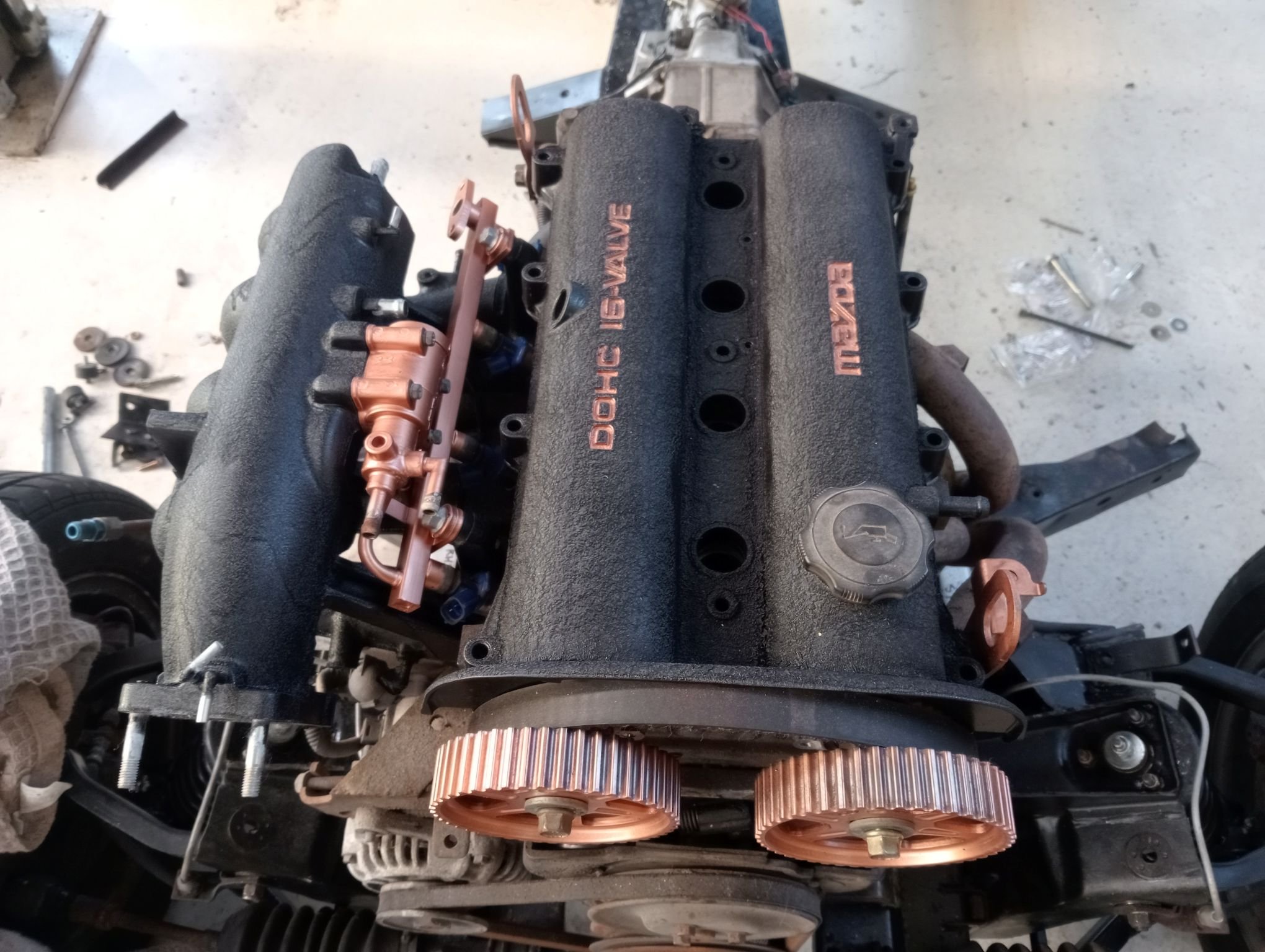 Popular Post gibbon Posted October 4 Author Popular Post Posted October 4 starting to look a little bit more purposeful now although really I just dropped the body on it I removed the (cant remember what it's called) air bypass doodad on the inlet manifold BECAUSE RACECAR, printed a cover for it which happens to look exactly like the wrinkle painted manifold. leading some to believe that the manifold itself was printed, a falsehood that I made no effort to dispel on the ground that it made me seem very talented also made a box for the ECU which is a speeduino thing that I grabbed for the starion a million moons ago. It slots in under the battery tray. it was constructed by a shifty foreigner over covid so my mileage may quite literally vary this is the original front water neck, relocated to the rear of the head. I garked it out with a dremel machined it to accept the stock thermostat. clearance is still extremely tight i also bought these lovely cannon plugs because I wanted to have a quick-disconnect loom, only to realise I dont need them as the rear of the engine and most of the loom actually sit inside the cabin anyway and it would be trivial to unhook it from the ECU directly this is just a quick update as I realise I've also done quite a bit of other bits and pieces but not taken photos. I also have begun to notice a considerable decline in quality and standards as I slip into 'git er done' mode 16 Quote