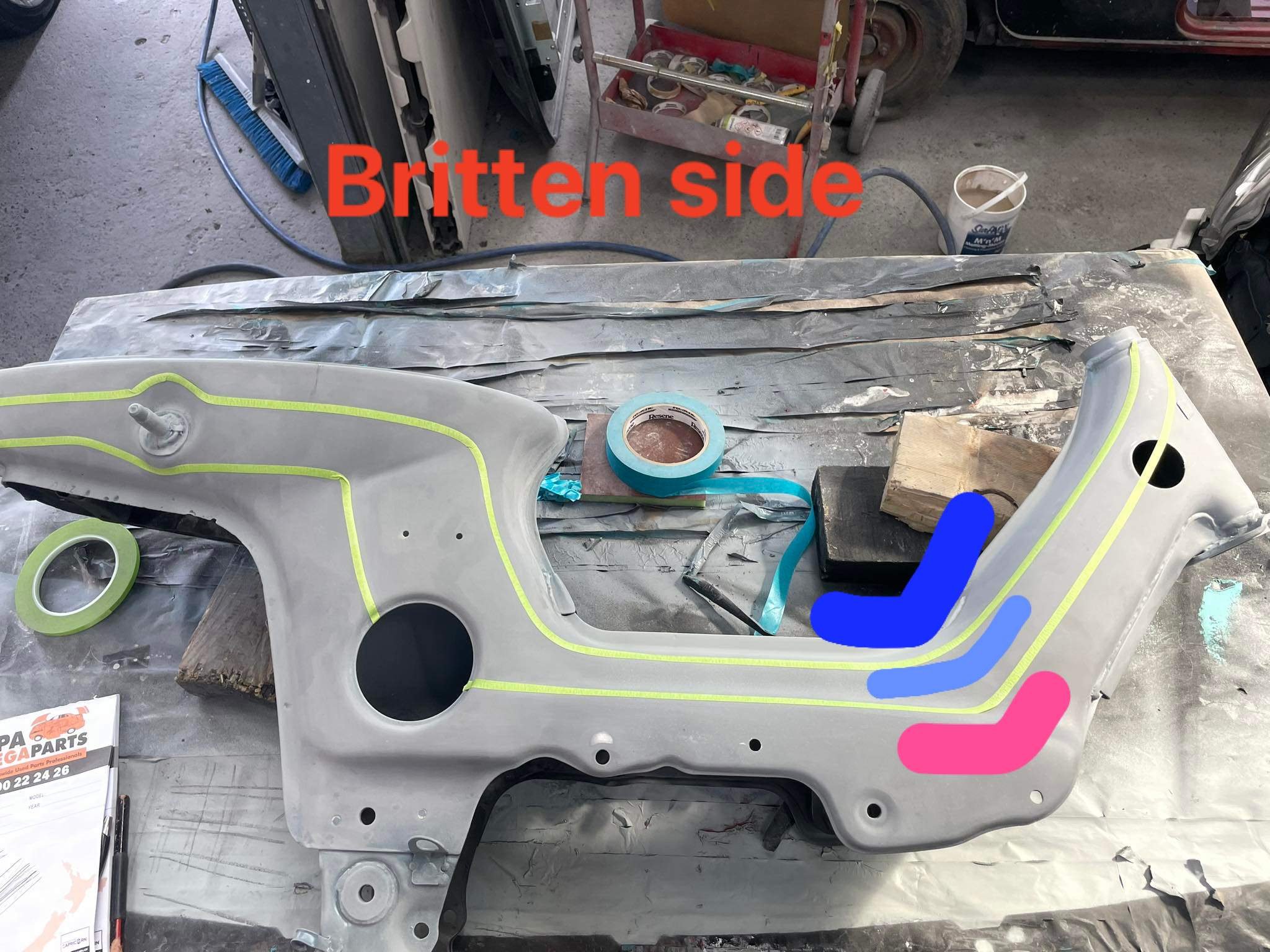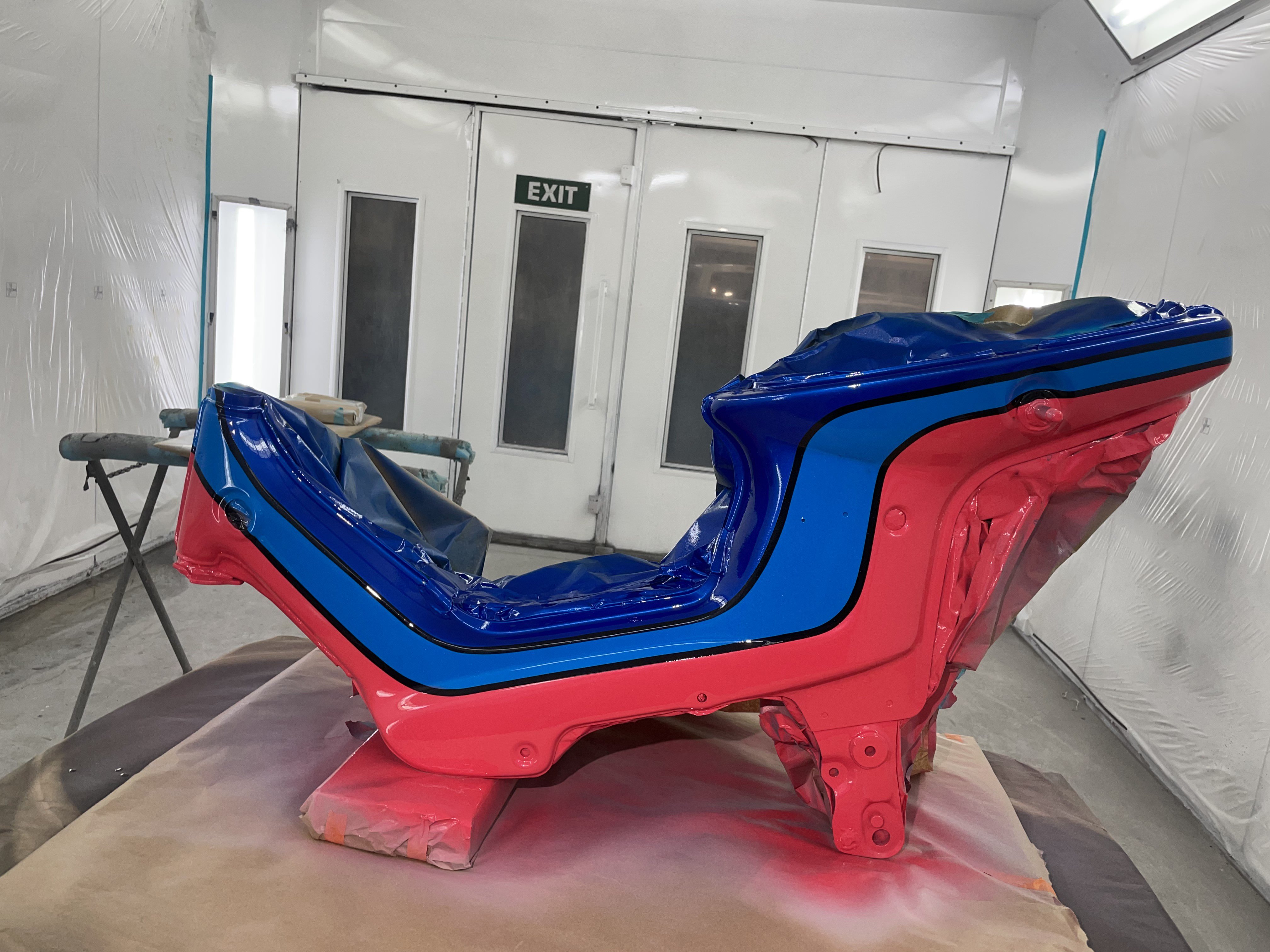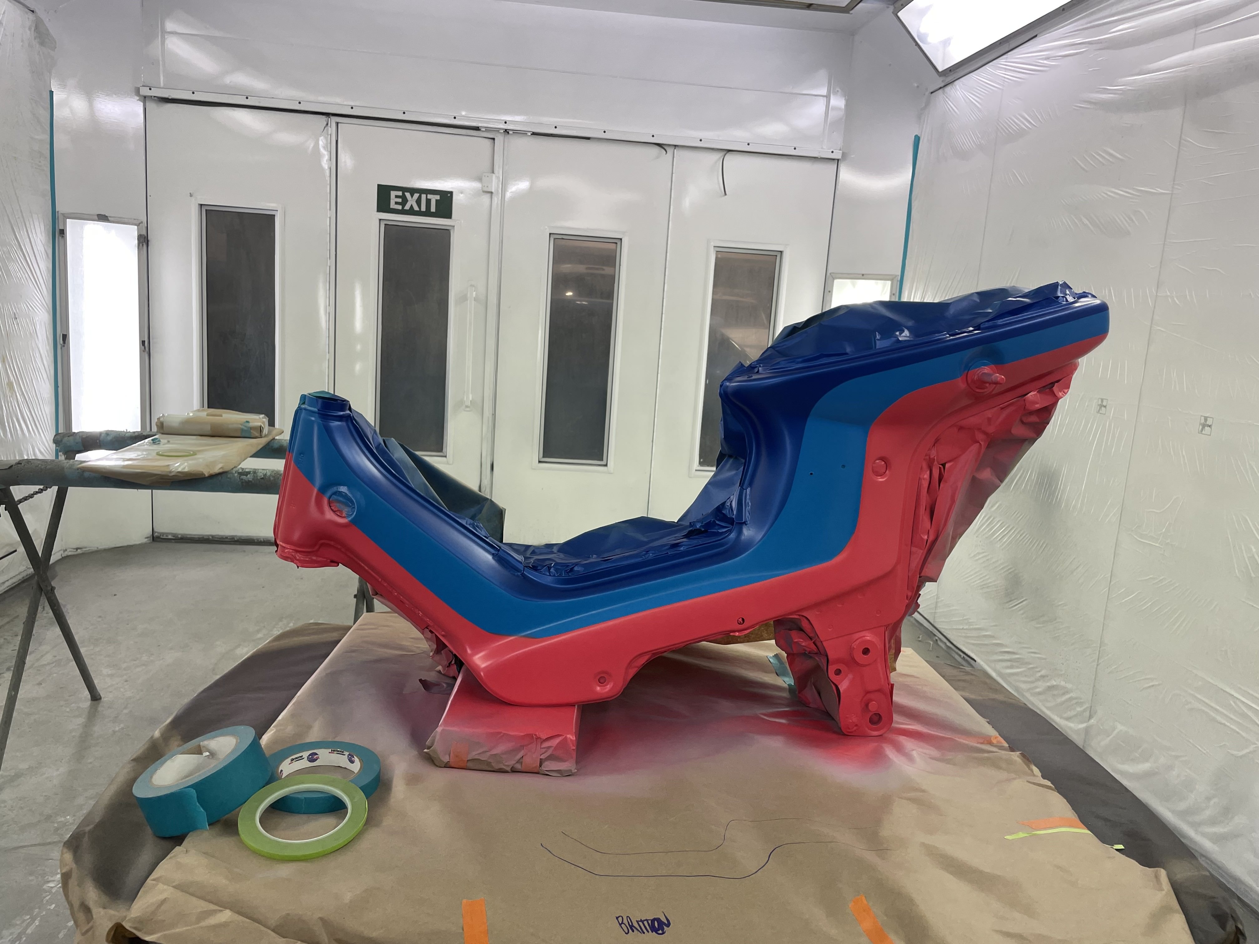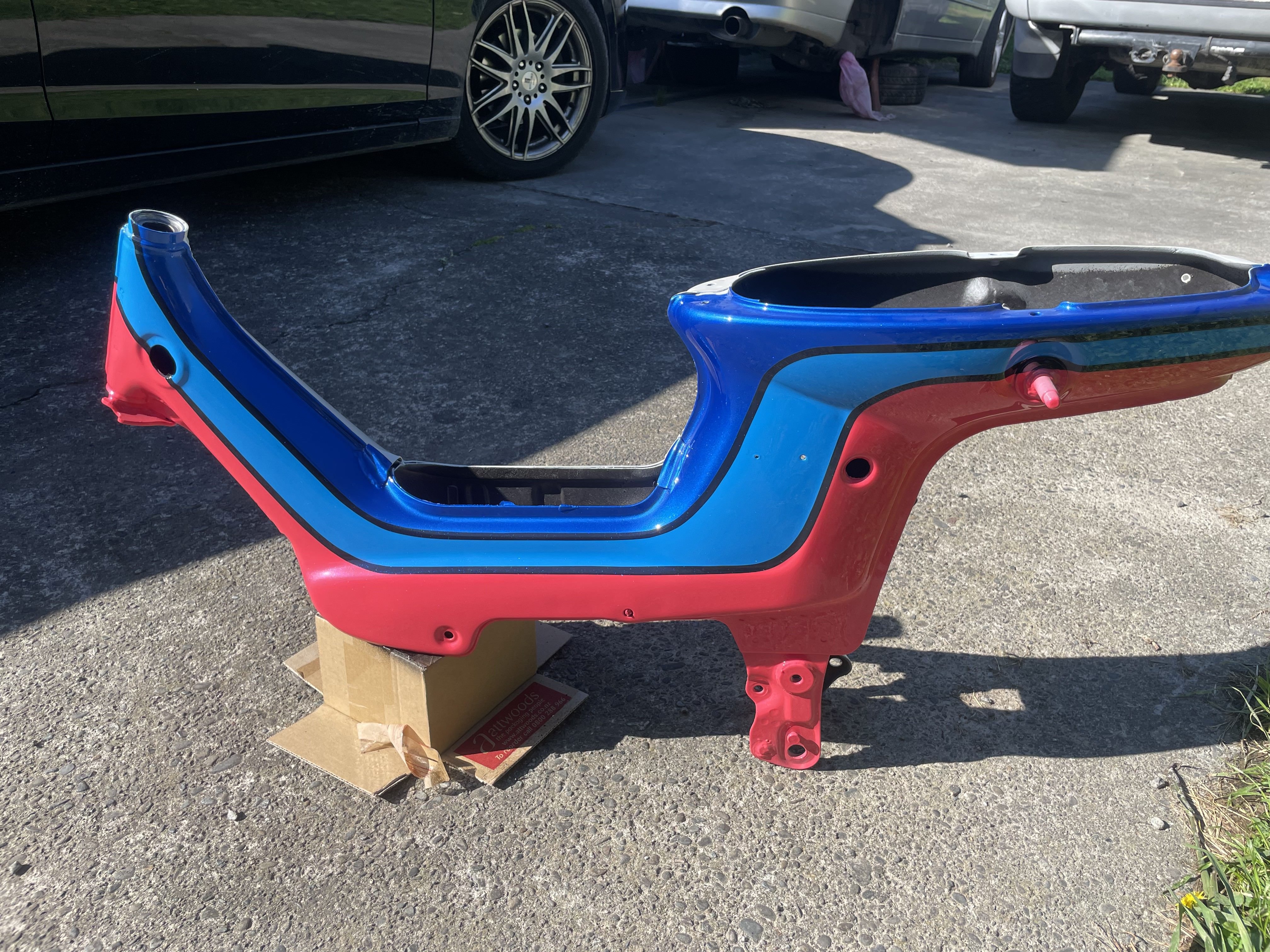 EmmyWest Posted October 12 Author Posted October 12 I decided to paint the bike in two different colours on each side. Mainly because I couldn't commit to just one theme on such a goofy bike, so why not make it look even goofier and kill two styles with one stone. First I started on the Britten themed side. had to make the pink from scratch (because apparently the PPG colour was a secret? not sure how much truth there is to it) as it was a bit hard to match the vividness. used the red dye from Mazda soul red to adjust the colour and by pretty much winging it, got it bang on. Used a Subaru metallic blue for the top blue, a ford falcon colour for the solid blue. overall this side took around 5 hours ish? if i remember correctly. 5 Quote