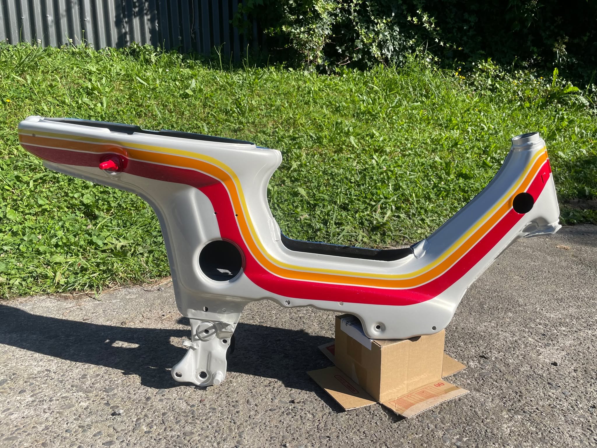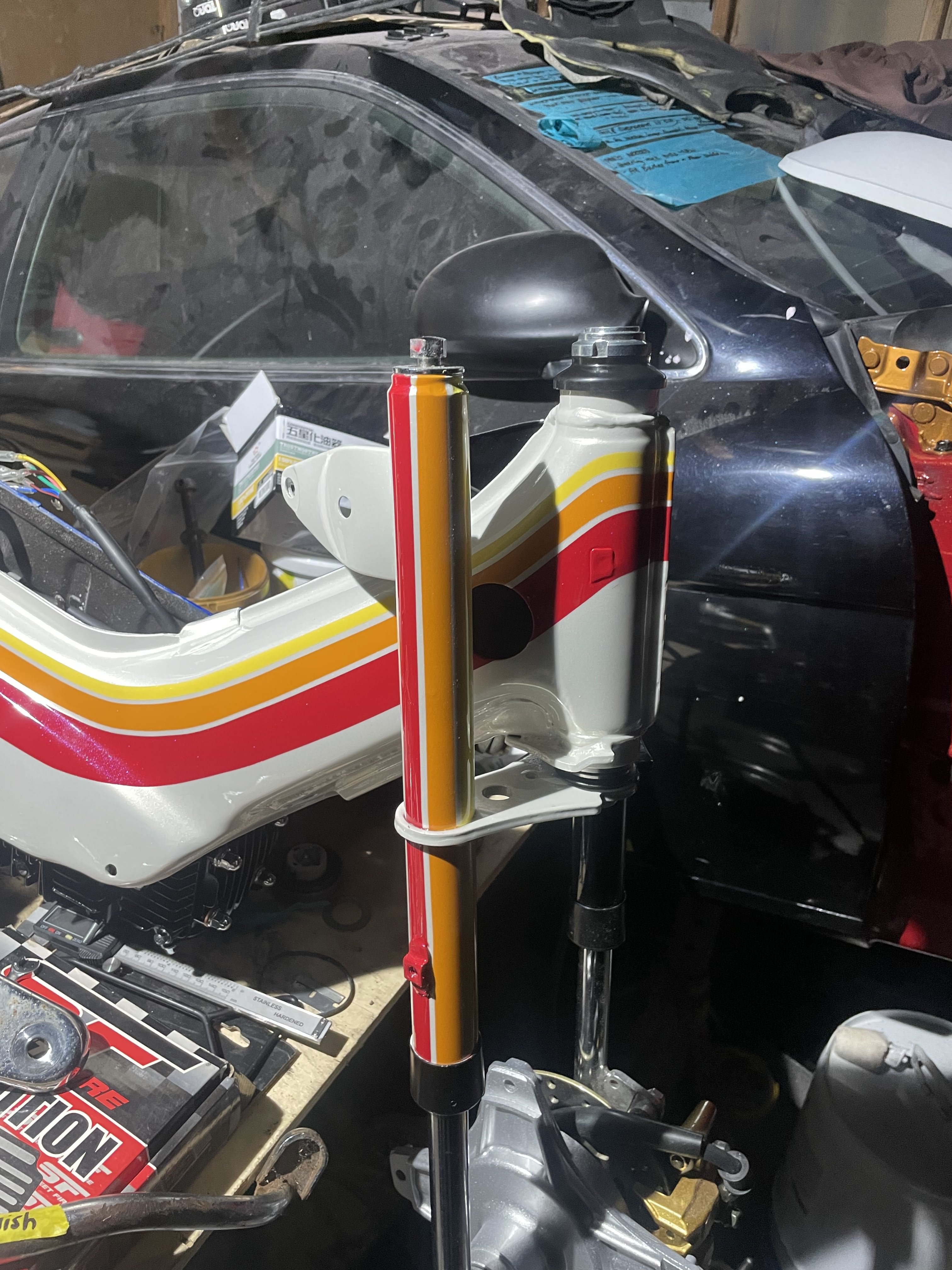 EmmyWest Posted October 12 Author Posted October 12 Hilariously I had spent a LOT of extra time painting the swing arm, which turned out well. but as for the front forks, after painting myself to exhaustion over this short period, I had accidentally painted the forks the wrong way around. It took so long masking out the colours again, but as big of a balls up this was, it was a blessing in disguise. Because I think the lines going opposing directions against the frame looks shit quite frankly. A simple example of why sometimes less is more. I had fixed this by re-painting the forks in Pearl white, and the Subaru blue metallic respectively. 3 Quote